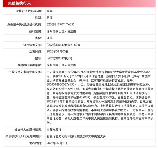 公开资料显示,2022年7月,双方赠与合同纠纷在徐州首次开庭。2023年1月,吴幽被列为被执行人,执行标的1100万余元。2月21日,吴幽被纳入失信名单,收到限制消费令。