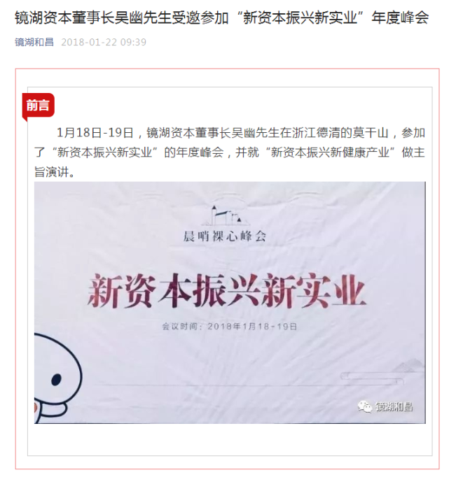 另据镜湖和昌官方微信号2018年1月22日文章,吴幽在浙江德清的莫干山,参加了“新资本振兴新实业”的年度峰会,并就“新资本振兴新健康产业”做主旨演讲。