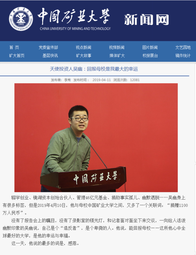 此桩纠纷,缘起中国矿业大学“史上最高捐赠”。2019年4月10日,中国矿业大学在110周年校庆之际,公开宣布其2008级校友吴幽捐赠1100万元人民币,支持学校事业发展。在当时,这是中国矿业大学成立后收到的最大单笔捐赠。