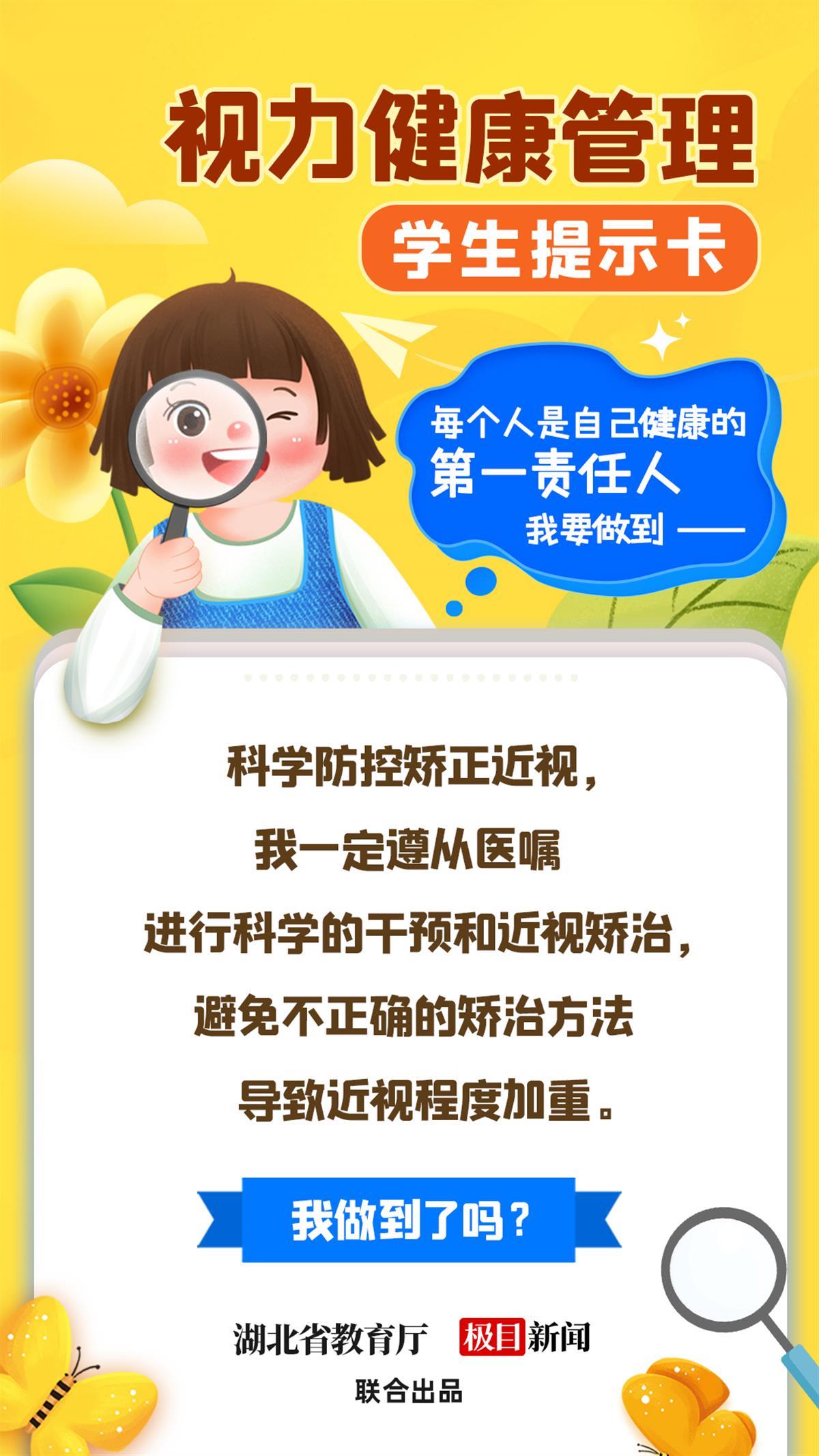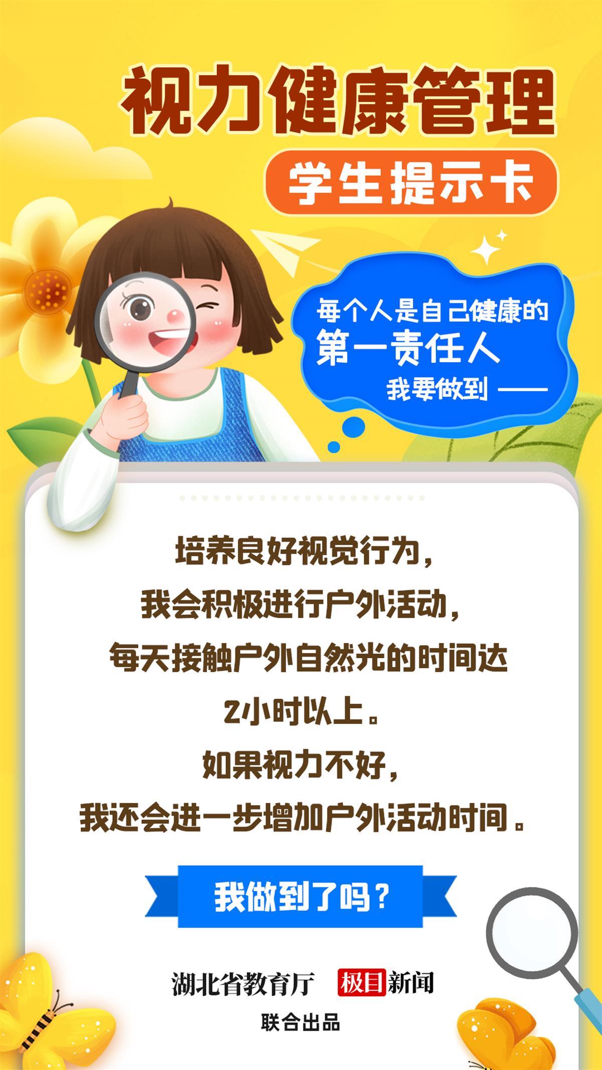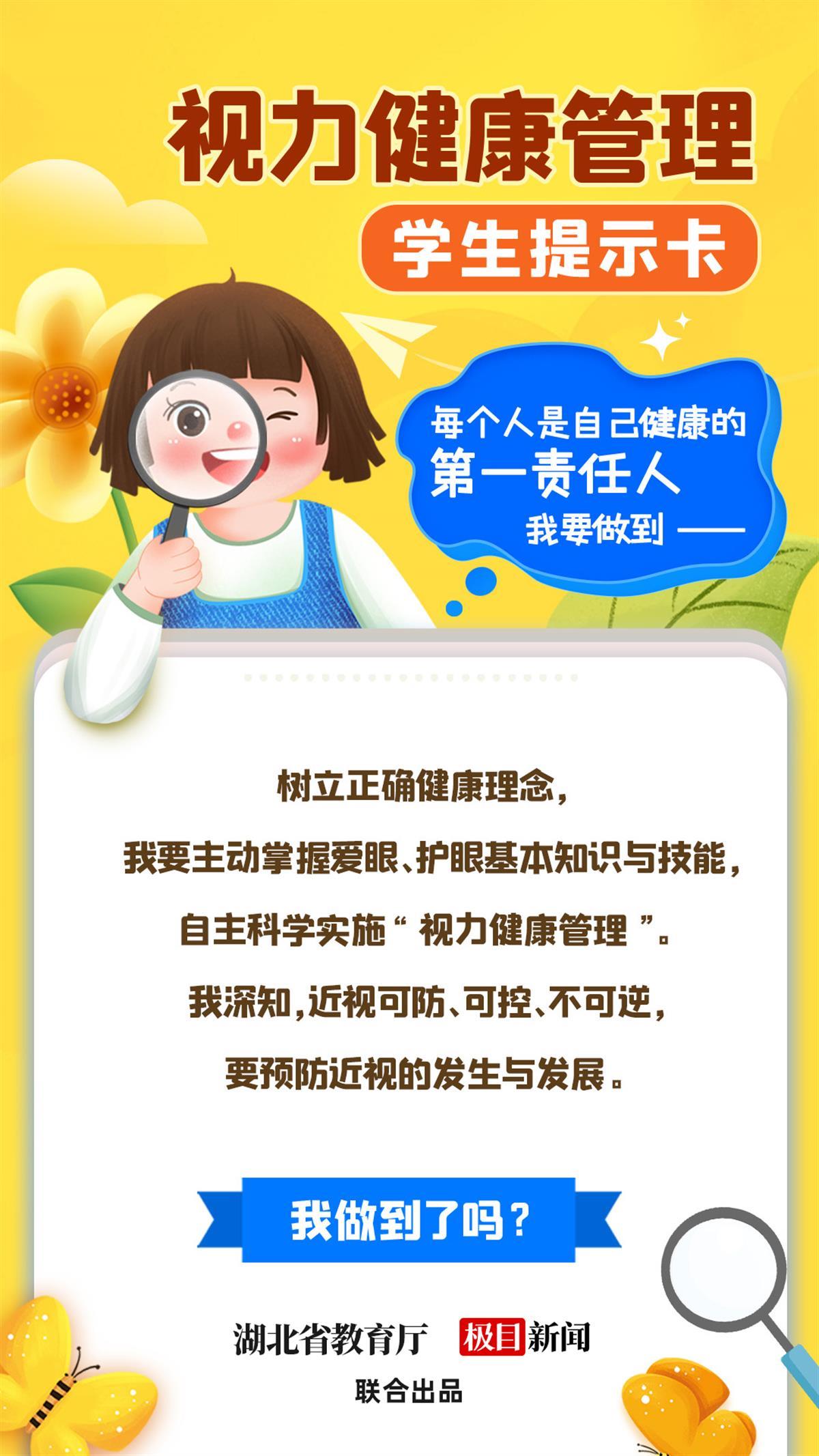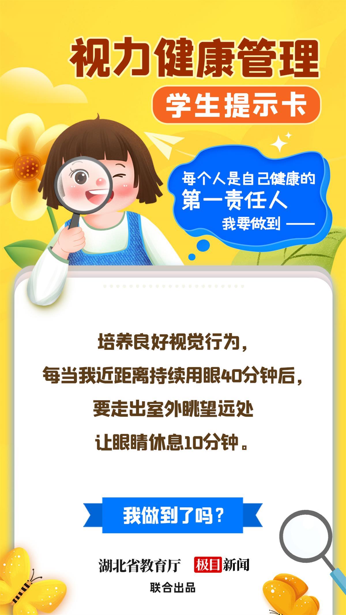每个人是自己健康的第一责任人。防控近视,学生们该怎么做呢?湖北省教育厅联合极目新闻制作了视力健康管理学生提示卡。不少学校表示,会将视力健康管理学生提示卡张贴在校园内,更好地推动儿童青少年近视防控宣传教育、提高近视防控知识普及率和知晓率、努力推动儿童青少年新发现近视率下降。