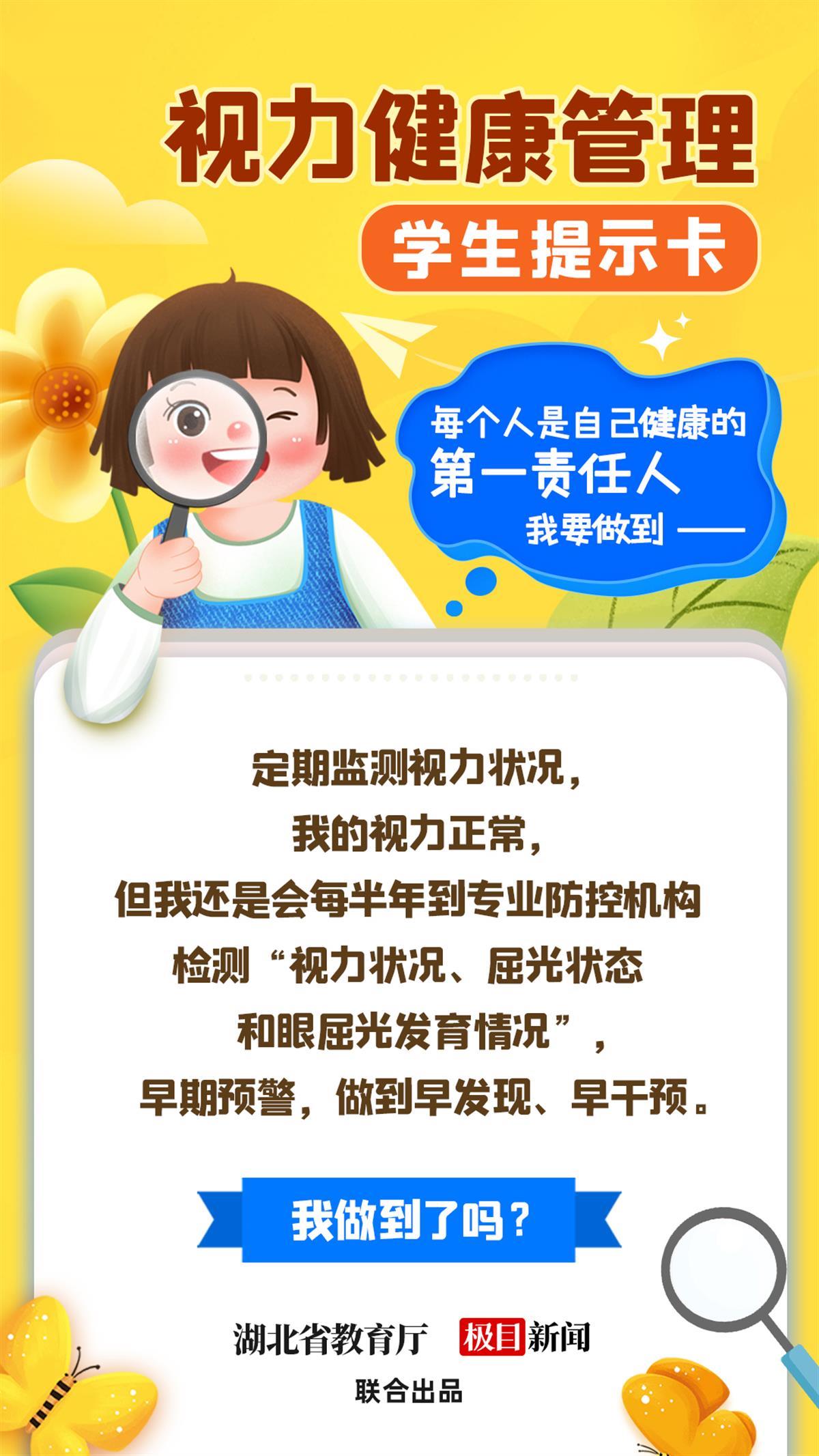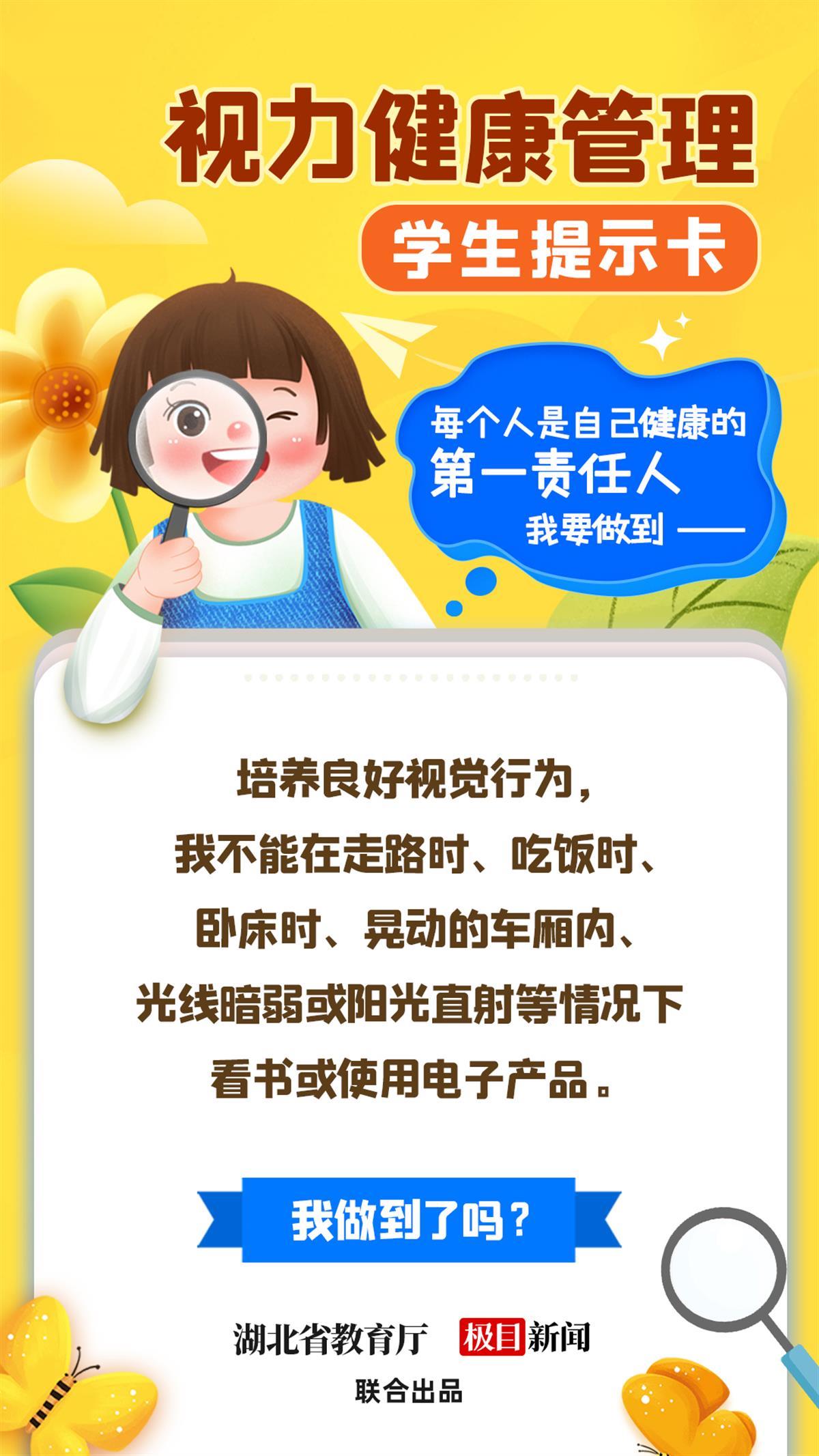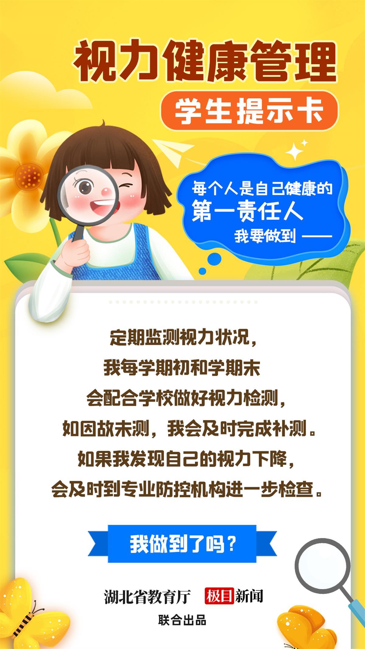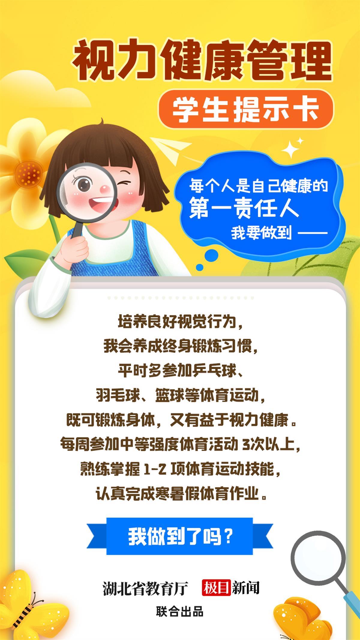 每个人是自己健康的第一责任人。防控近视,学生们该怎么做呢?湖北省教育厅联合极目新闻制作了视力健康管理学生提示卡。不少学校表示,会将视力健康管理学生提示卡张贴在校园内,更好地推动儿童青少年近视防控宣传教育、提高近视防控知识普及率和知晓率、努力推动儿童青少年新发现近视率下降。