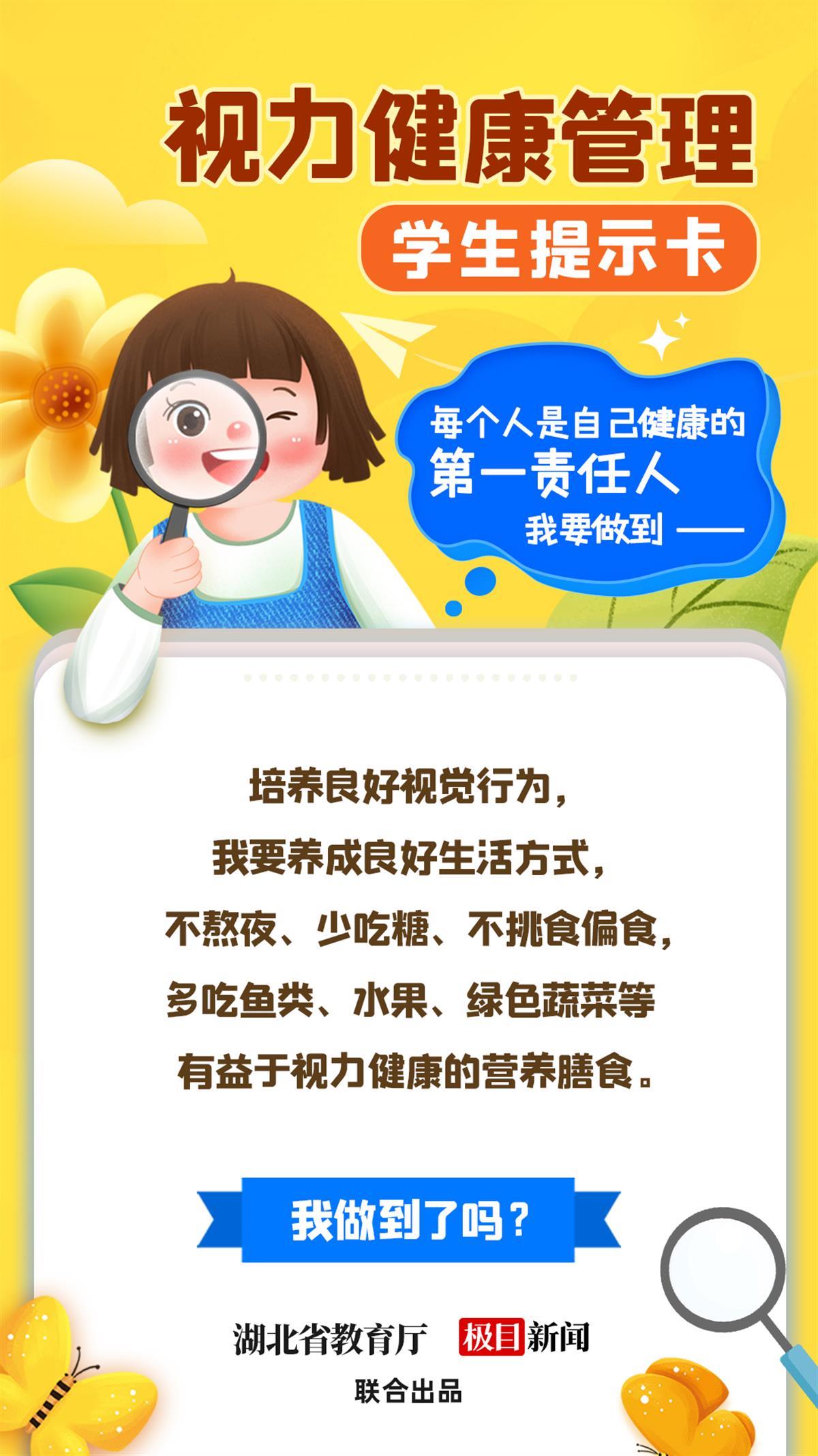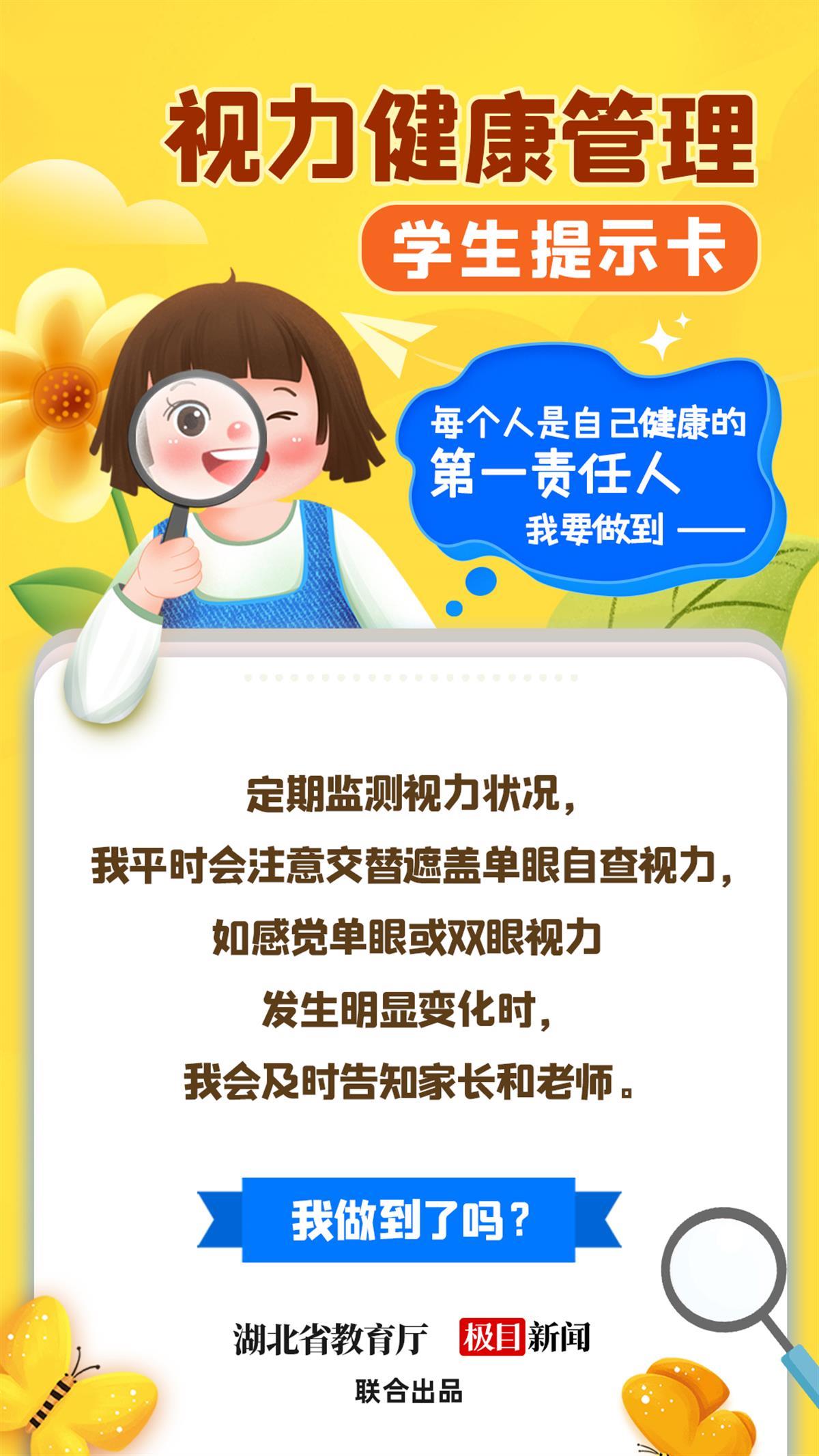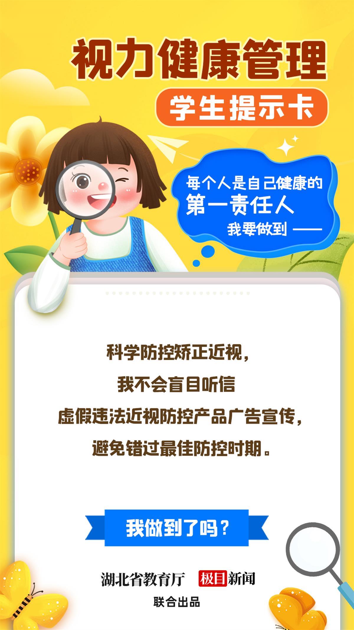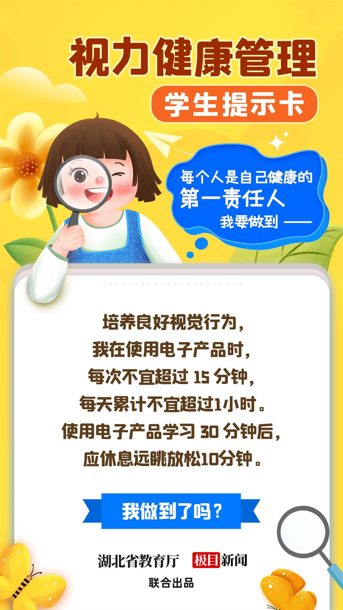 每个人是自己健康的第一责任人。防控近视,学生们该怎么做呢?湖北省教育厅联合极目新闻制作了视力健康管理学生提示卡。不少学校表示,会将视力健康管理学生提示卡张贴在校园内,更好地推动儿童青少年近视防控宣传教育、提高近视防控知识普及率和知晓率、努力推动儿童青少年新发现近视率下降。