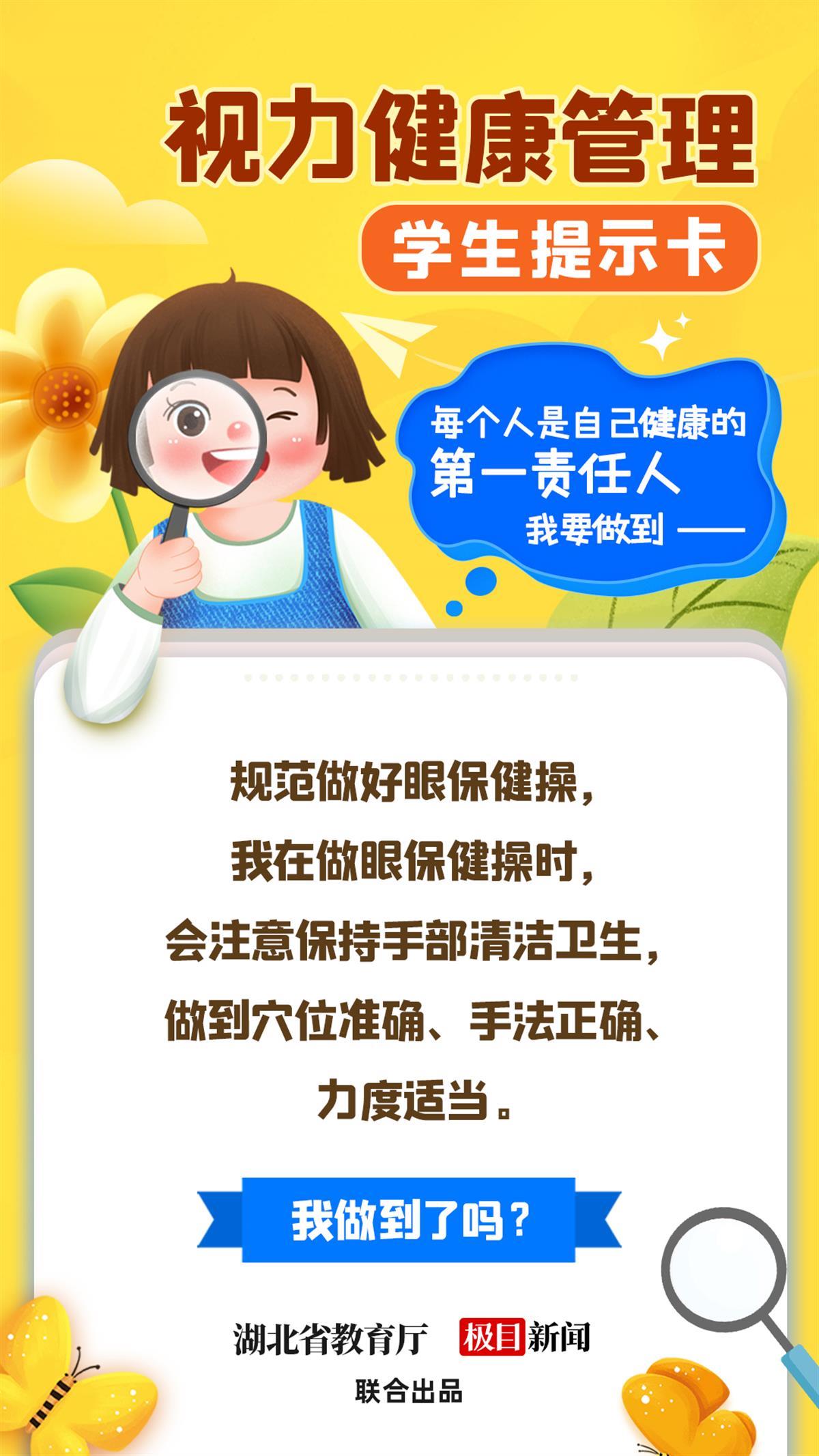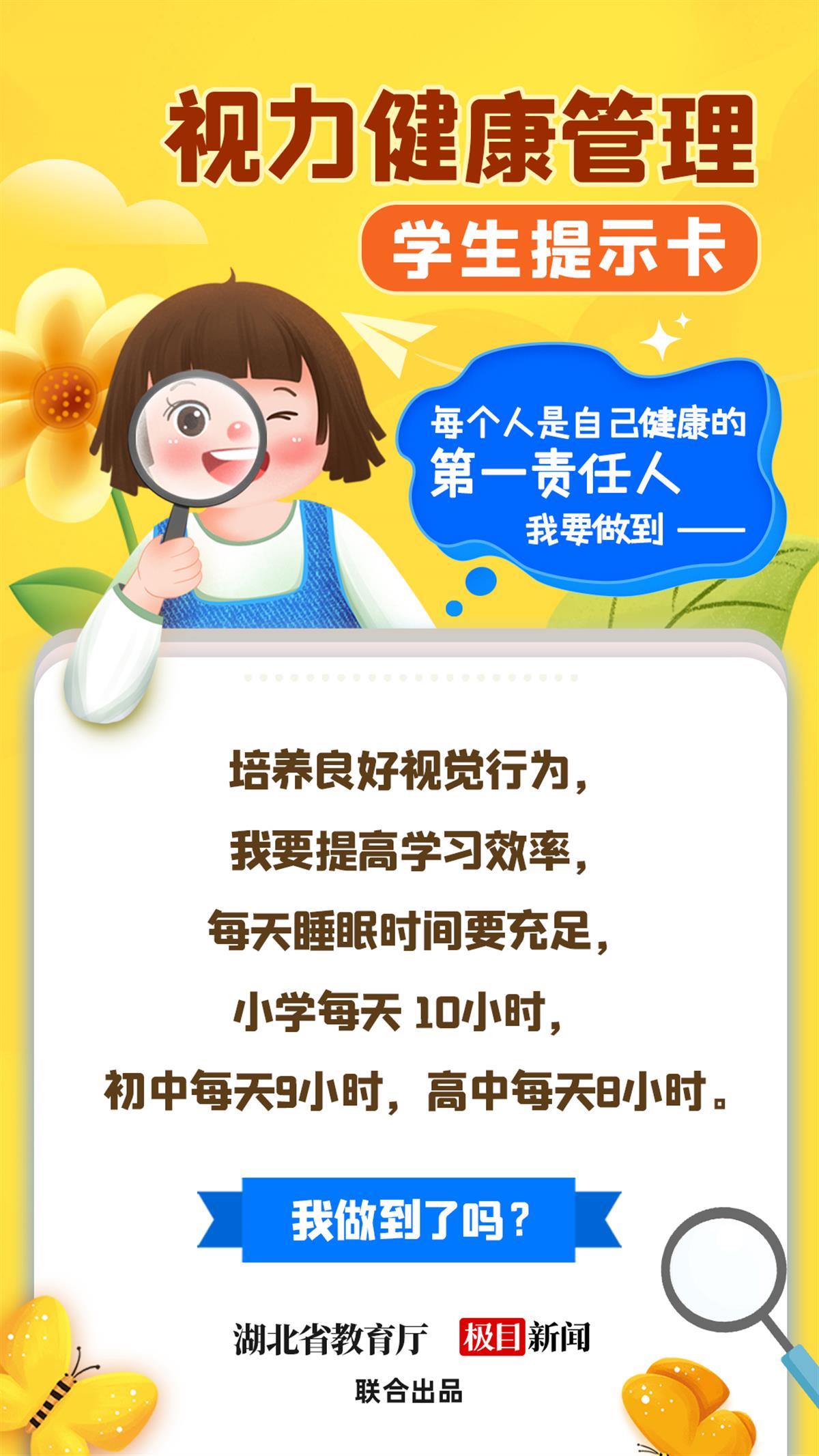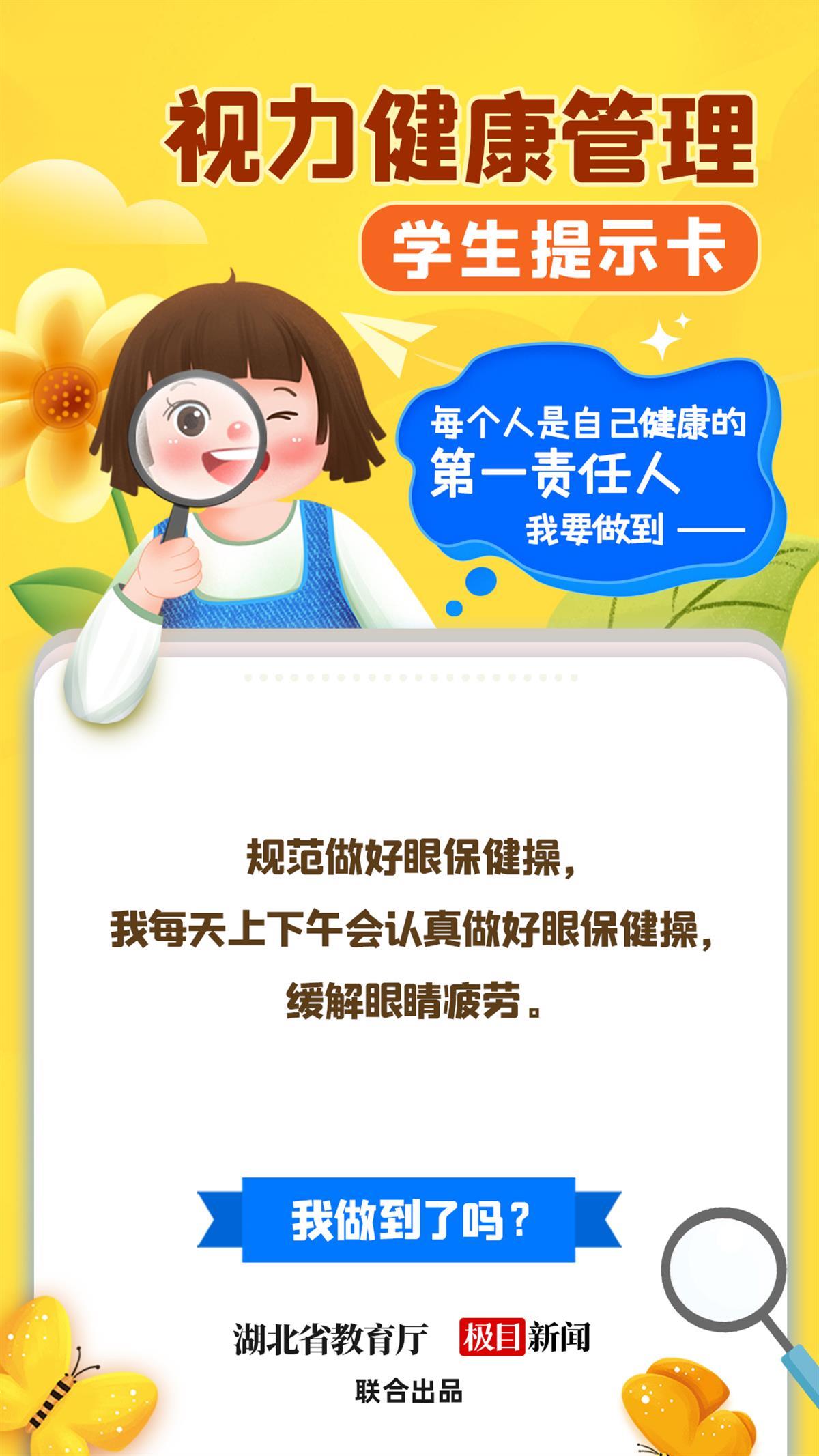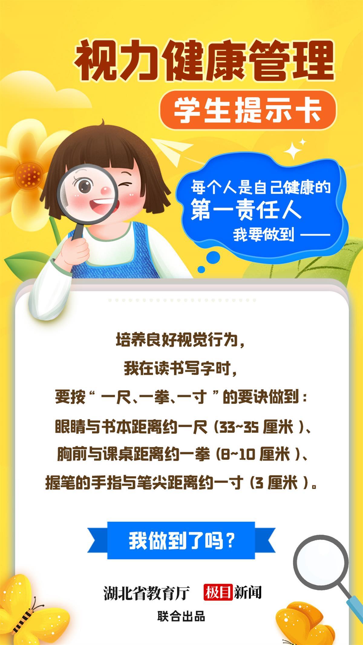 每个人是自己健康的第一责任人。防控近视,学生们该怎么做呢?湖北省教育厅联合极目新闻制作了视力健康管理学生提示卡。不少学校表示,会将视力健康管理学生提示卡张贴在校园内,更好地推动儿童青少年近视防控宣传教育、提高近视防控知识普及率和知晓率、努力推动儿童青少年新发现近视率下降。