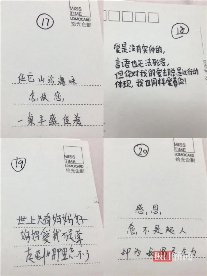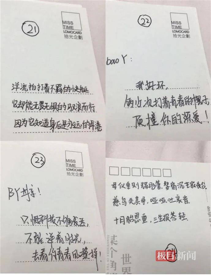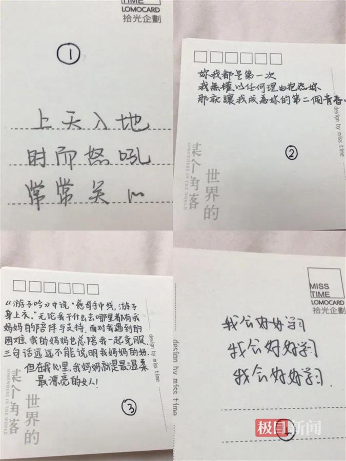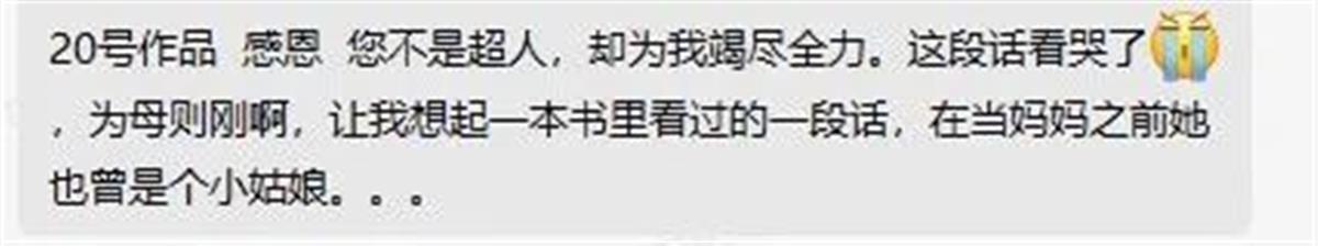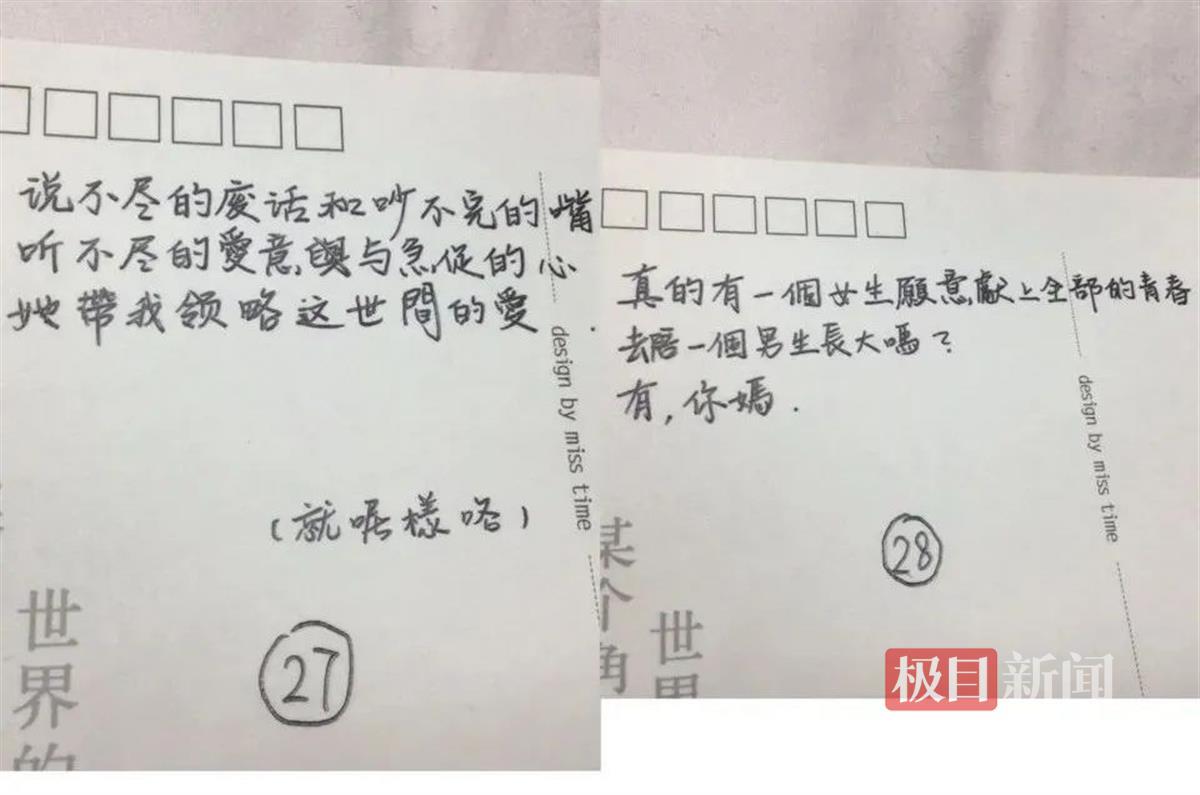 17岁的少年们交出了令人惊艳的答案:有人仅用“上天入地/时常怒吼/常常关心”这12个字就刻画了一个有吼有爱的超人母亲形象;有人简单直给,直接写上三排“我会好好学习”;有人写“感恩/您不是超人/却为我竭尽全力”;有人幽默写道“真的有一个女生愿意献上全部的青春/去陪一个男生长大吗/有,你妈”;还有孩子借机反省“我好坏/多少次打着青春的幌子/顶撞你的深爱!”……