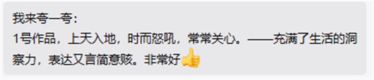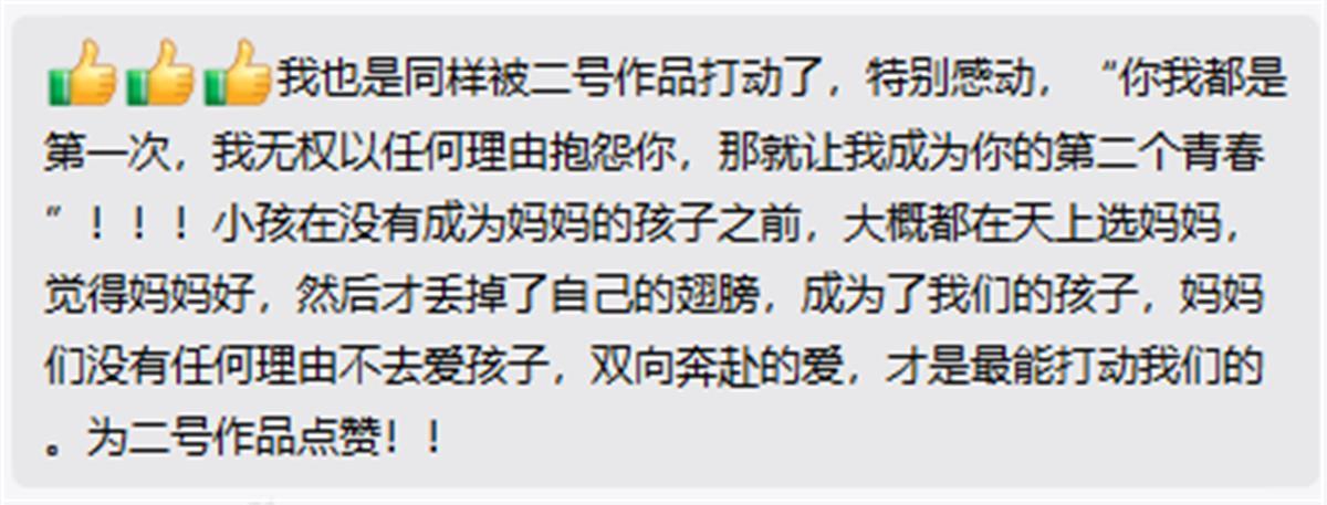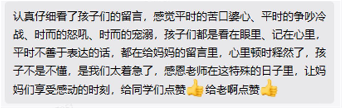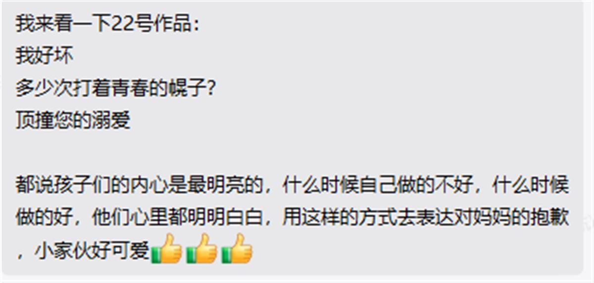 这些作品被匿名分享给了全班家长,得到了许多妈妈的“夸”:“12个字的作品充满了生活的洞察力,表达言简意赅,非常好”;“看哭了,妈妈从前也是小姑娘,只是为母则刚”;“那个写丰盛佳肴的是夸我的呢!妈妈们有个通病,孩子喜欢哪道菜就拼命做”“孩子知道自己做得好和不好,借这个机会说抱歉,聪明又可爱”……