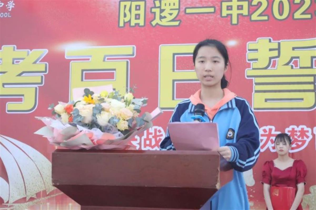 “鲜衣怒马少年时,行而不辍踏平川!十载寒窗,百日苦练,我们健步登金榜; 一腔热血,万丈豪情,阳逻一中定能创辉煌!”来自九(8)班的沈诗妍同学,作为学生代表号召大家,在最后一百天里,爬上“书山”走“勤径”,渡过“学海”坐“苦舟”。