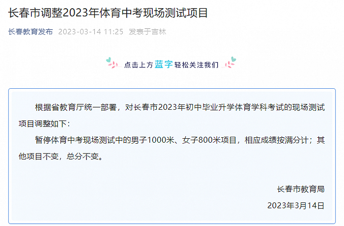 3月14日,长春市教育局发布消息,根据省教育厅统一部署,对长春市2023年初中毕业升学体育学科考试的现场测试项目调整如下:暂停体育中考现场测试中的男子1000米、女子800米项目,相应成绩按满分计;其他项目不变,总分不变。