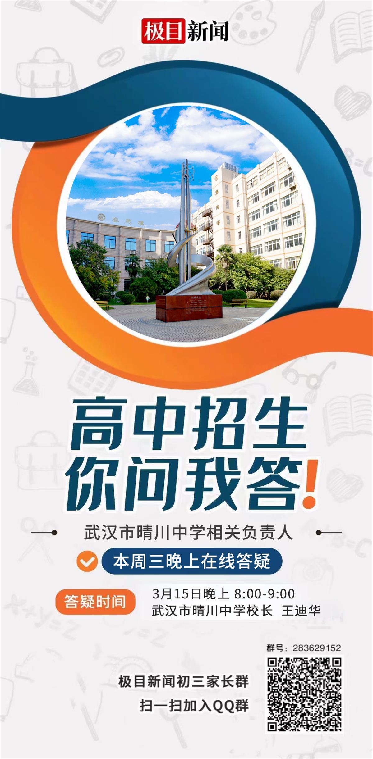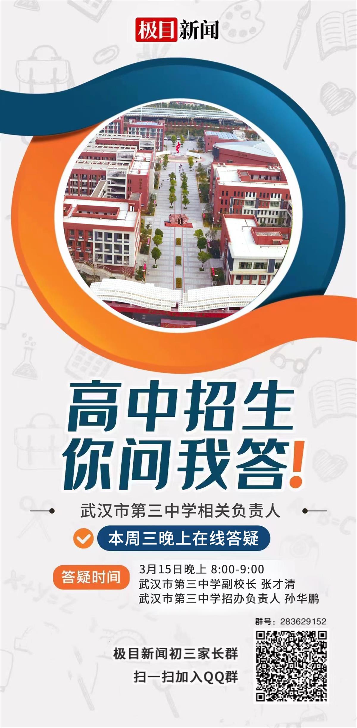 本次活动,极目新闻邀请了武汉市第三中学教育集团武汉三中副校长张才清、招办负责人孙华鹏,以及武汉市晴川高中校长王迪华进行在线答疑,具体答疑时间为3月15日(本周三)晚20:00-21:00。