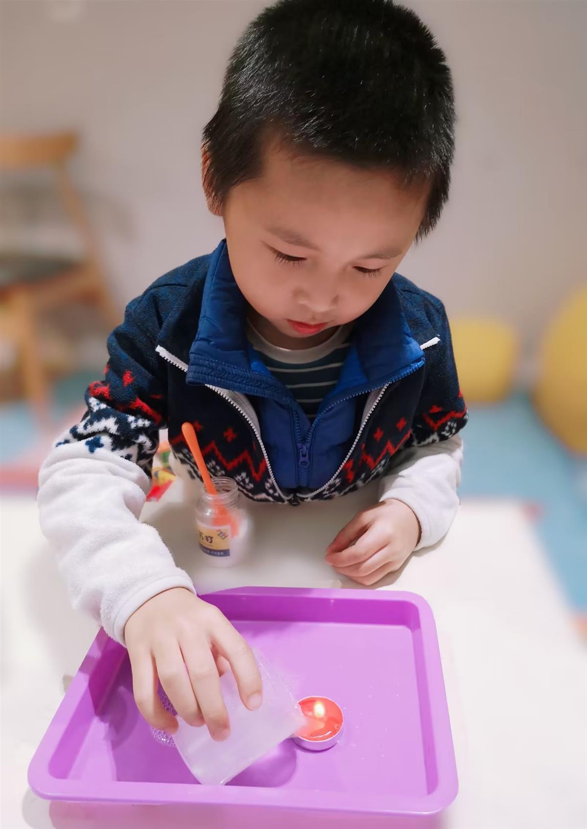 “珞珈山幼儿园有让小朋友记录每日游戏的习惯,所以在做实验的时候,就延续了这种方式,让他自己把科学实验画出来,我觉得这是一种很不错的记录方式。”姚然的妈妈说:“刚开始做实验的时候,有时候是缺乏耐心的,会要求家长帮他做,后来兴趣慢慢起来了,我们引导他让他全程自己动手,家长在一旁指导就行。比如,‘蜡烛吸水’刚开始姚然小心翼翼,不敢动手,看家长做了几次后,觉得很有意思,才愿意自己尝试。”