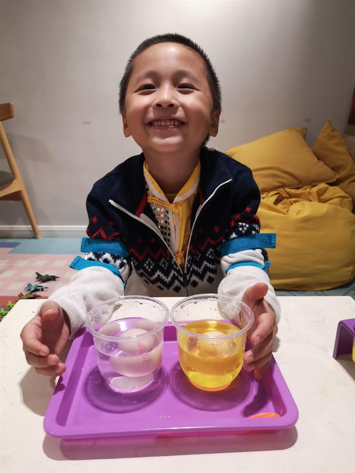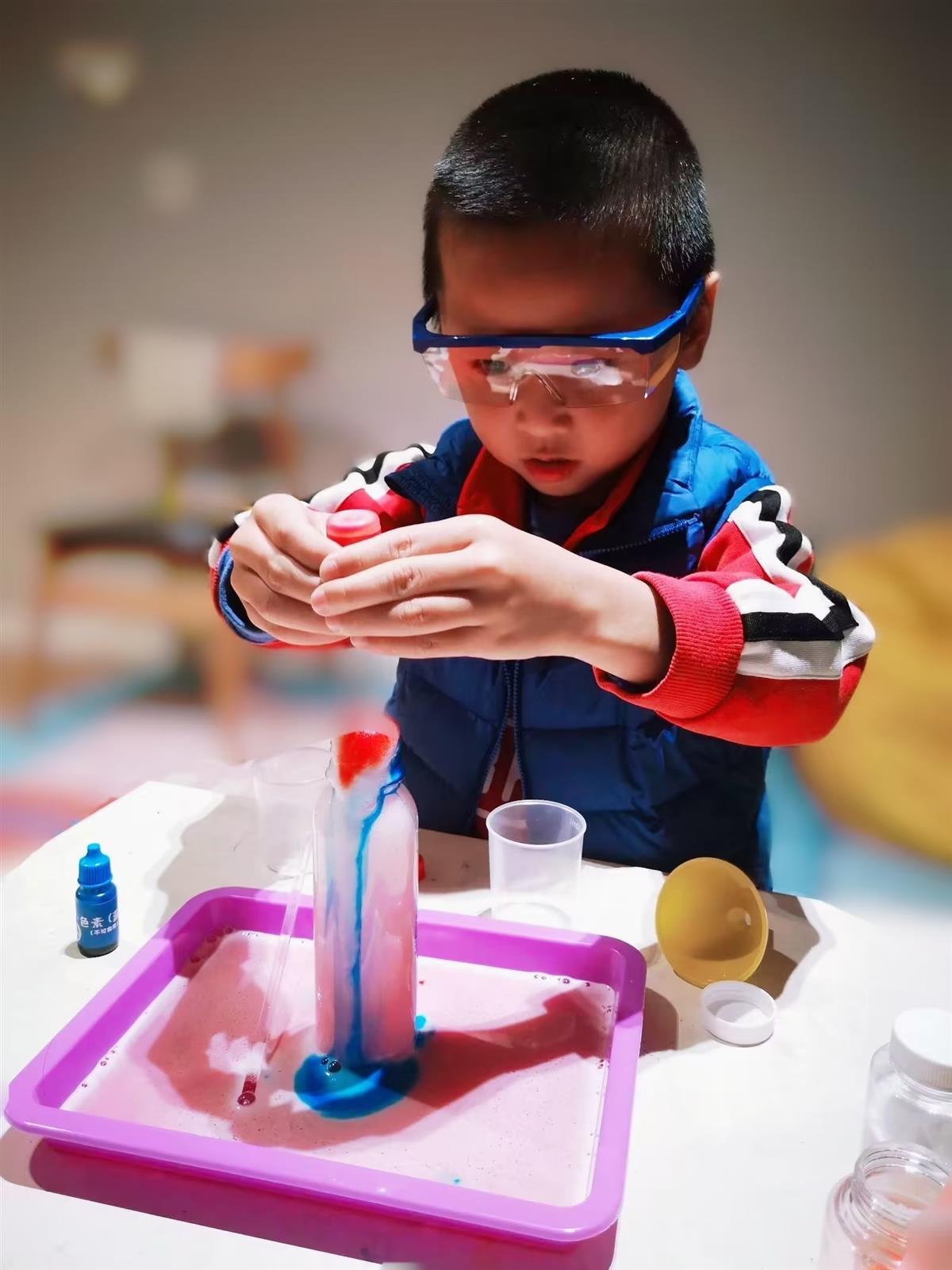 “我们觉得首先锻炼孩子的动手能力和观察力,从刚开始的需要父母参与,到后面自己全程完成,不断地加强他的动手实操能力。其次,提升了孩子的耐心和专注力,有的实验是可能会失败的,也有的是需要等待很长时间的,这就需要有他要有足够的耐心。比如,‘紫甘蓝溶液变色’实验中,需要将紫甘蓝溶解到水中,需要很有耐心地长时间搅拌,有些甚至需要隔天继续观察。‘彩色透明球’,利用海藻酸钠和乳酸钙反应生成有硬度和弹性的凝胶,需要等待四十多分钟,海藻酸钠放入水中溶解也需要较长时间,就很需要耐心。”姚然的妈妈告诉记者:“通过实验,孩子可以了解到更多生活中的常识。比如,做蔬菜换装,白菜叶子放在有素色的水里会变色,就延伸让他去了解和学习了一些植物的构造。悬浮鸡蛋,把鸡蛋放在盐水里面会浮起来,了解了为什么人在死海不会被淹死,也进一步会去了解一些会溶解在水中的物质,以及去探究为什么有些东西会在水上浮起来,而有些会沉下去。他最喜欢的还是彩色喷泉,柠檬酸和洗洁精溶液倒入小苏打水溶液中,产生大量气体,洗洁精产生泡沫喷发出来,在这个过程中认识了生活中很常见的洗洁精。”