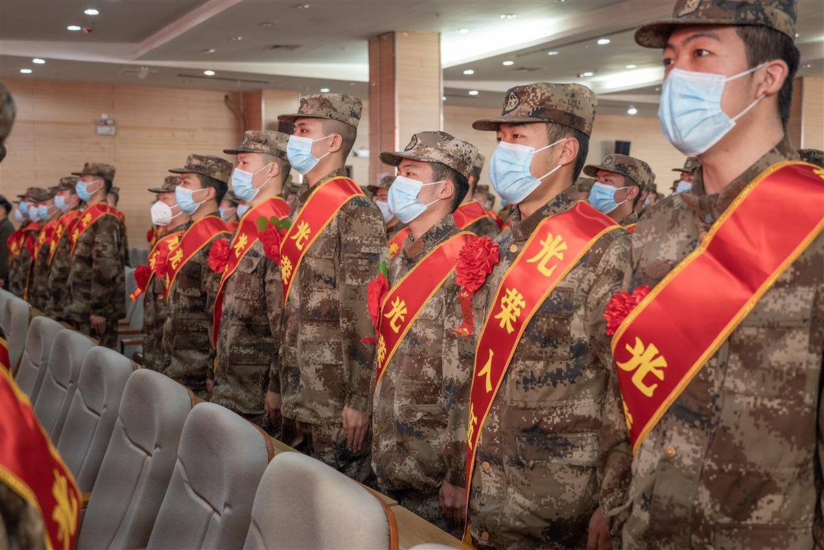 春光无限好,披红赴军营。军士生踏上新新征程前,全体校领导为军士生代表颁发了入伍通知书和纪念品、佩戴大红花。现场全体人员合唱《强军战歌》。