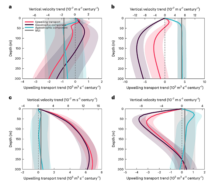 本研究利用中国海洋大学参与研制的高分辨率地球系统模式并结合CMIP6多模式数据,首次全面分析了世界四大东边界上升流系统(加利福尼亚、加纳利、本格拉和秘鲁上升流系统)对气候变化的响应。研究表明,尽管风场引起的离岸埃克曼输运对上升流的气候平均态强度起决定性作用,但上升流的长期变化趋势不再由风场变化所主导,而是受到地转流引起的输运变化的控制。此外,研究进一步表明,尽管北半球上升流系统的海表温度增加相对开阔大洋较慢,但南半球上升流系统的情形则正相反。后者主要是因为东边界流自身减弱导致的冷平流减弱。南半球东边界流的减弱则与大西洋经向翻转环流的减弱以及海盆尺度的风场变化有关。