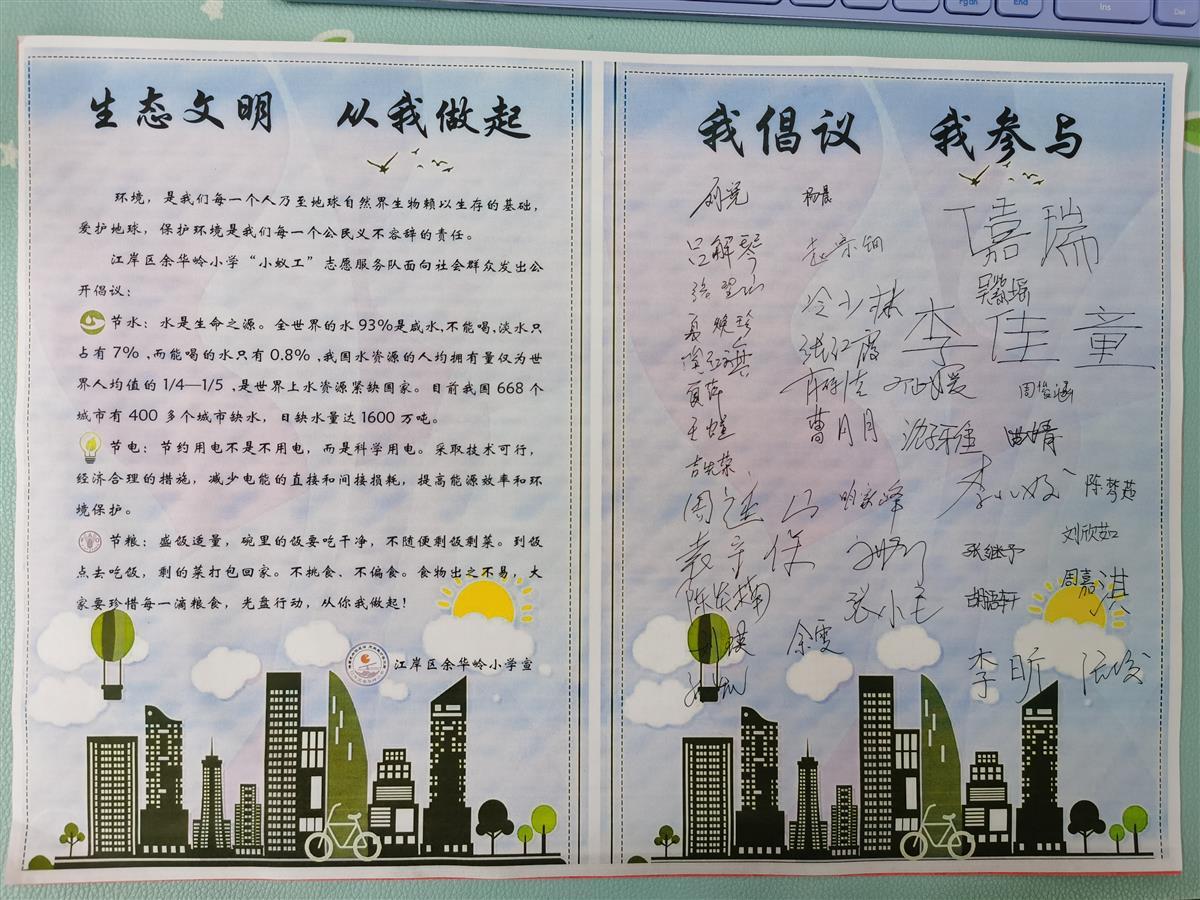 通过主题班会,同学们了解到生活中水资源的污染和浪费很严重,明白每一滴水的重要性,三年级和六年级同学纷纷自发组建节水宣传小分队,他们精心绘制节水宣传海报、设计宣传标语,将宣传海报张贴至校园水池处,倡导全校同学树立节约用水的意识,培养良好的用水习惯;六(2)班的吴紫瑶拿着亲手绘制的宣传单,带领志愿小分队成员走进余华岭社区,向来往的路人、商户发放节水宣传画报,邀请大家在“生态文明 从我做起”承诺书上签字,呼吁居民们提高节水意识,积极参与到爱水护水行动中来。