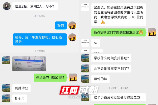 此前,彭老师在学校教职工微信群了解到,学校将通过大数据筛选的方式为学生发放餐补。随后,她特意找到梁宏军,表示自己愿意为特别困难的学生提供资助。