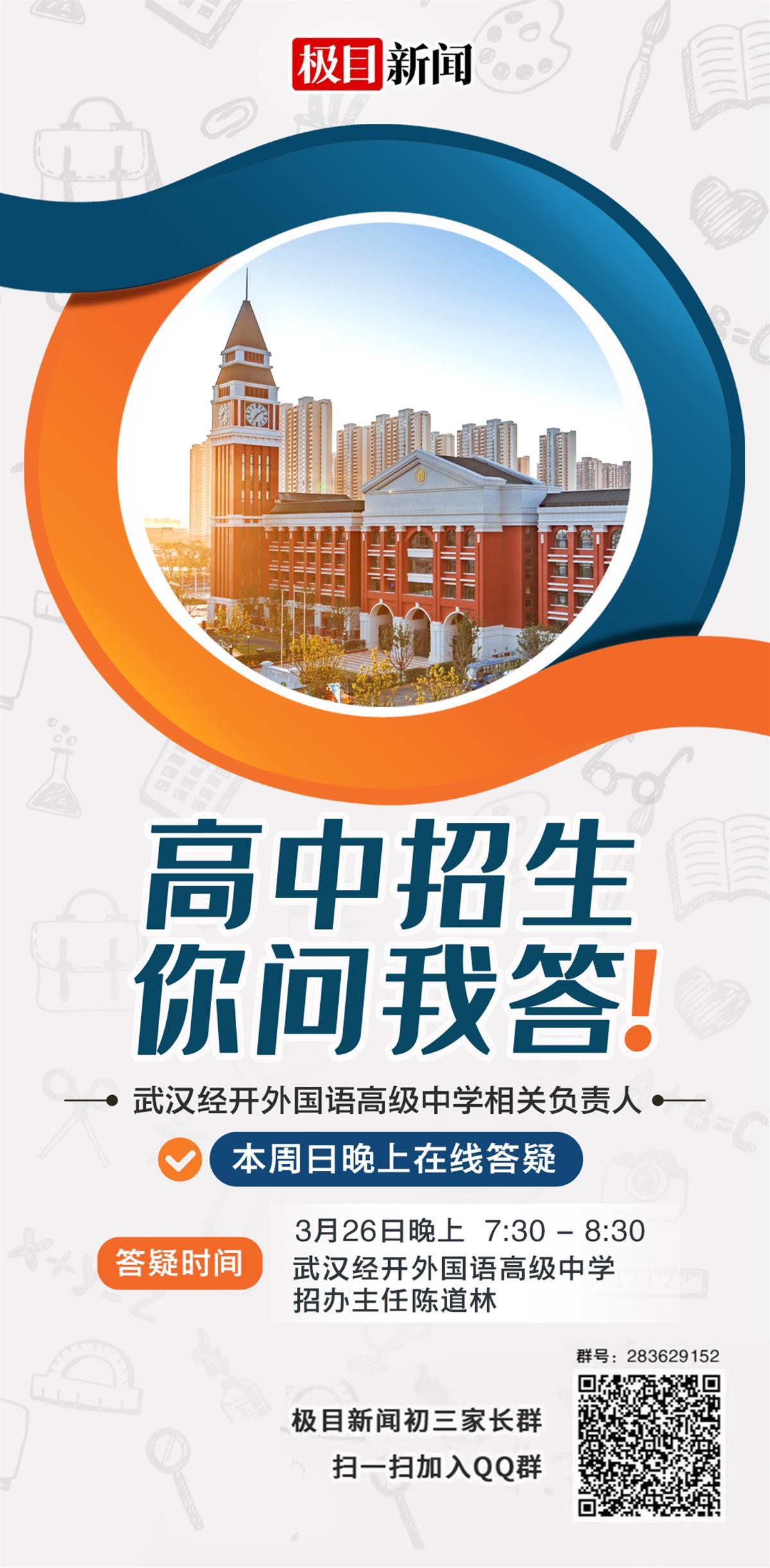 3月26日(周日)晚7时30分-8时30分,极目新闻的三个家长群里,将同步举行武汉经开外国语学校专场答疑活动。届时,武汉经开外国语高级中学(经外高中)招办主任陈道林将解答家长疑问。