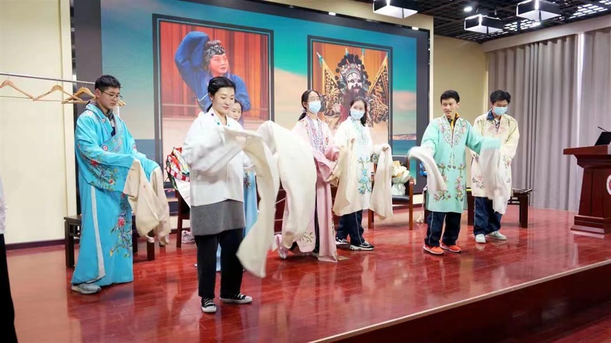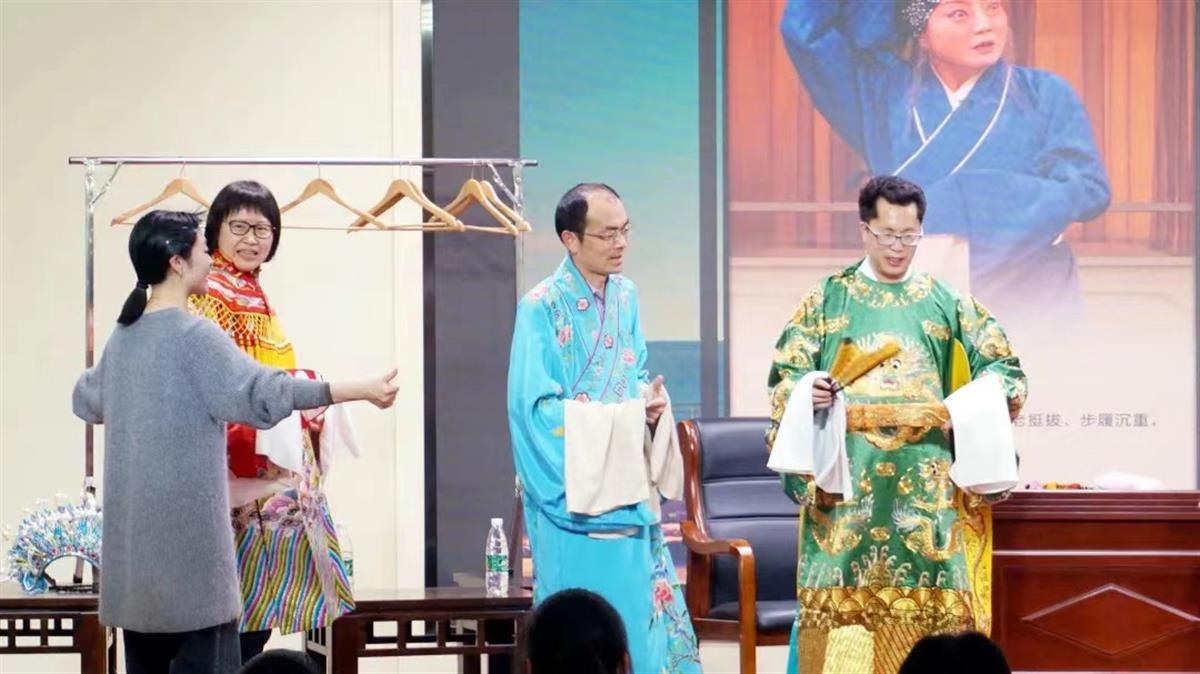 耳闻目睹之后,王晓璐与胡梓煜邀请部分同学和三位老师上台身穿戏服模仿汉剧的一招一式,亲身感受汉剧艺术的魅力,全体师生积极踊跃、兴致高昂。