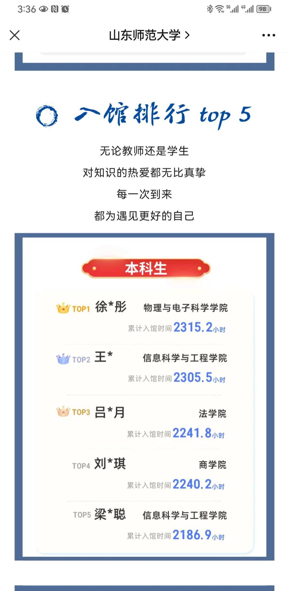 山东师范大学大四学生徐晓彤是2022年在学校图书馆入馆时间最长的学生。