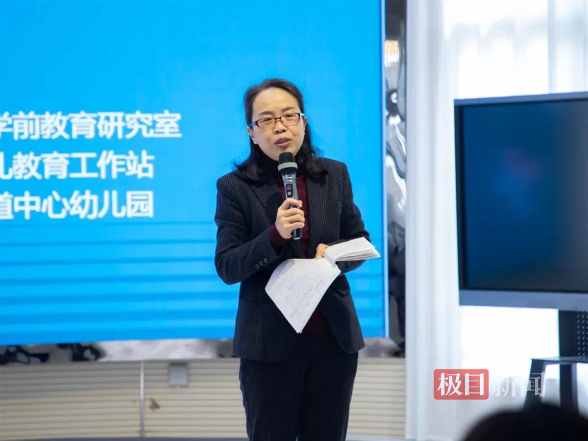 活动中,蔡榨中心幼儿园园长朱霞代表黄陂区作“园际项目共同体”教研机制的实践探究经验分享。朱霞介绍,黄陂区根据近年来各类型幼儿园数量增加较快的实际,在“公办引领、融合发展”的目标下形成了“园际项目共同体”教研机制,借助市教科院教研专业力量与资源平台,“重点突破、难点攻坚、共建共享”,促进了幼儿园与小学科学衔接,推动了区域学前教育高质量发展。
