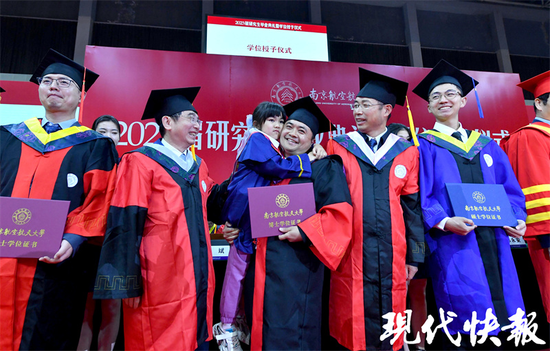4月6日,南京航空航天大学举行2023届研究生毕业典礼暨学位授予仪式,3099名硕博士研究生圆满完成学业,奔赴远方、再启新程。典礼现场,材料科学与技术学院38岁的博士研究生焦自保带着8岁的女儿焦博语一起登上学位授予的舞台,他希望女儿见证自己人生中的重要时刻。