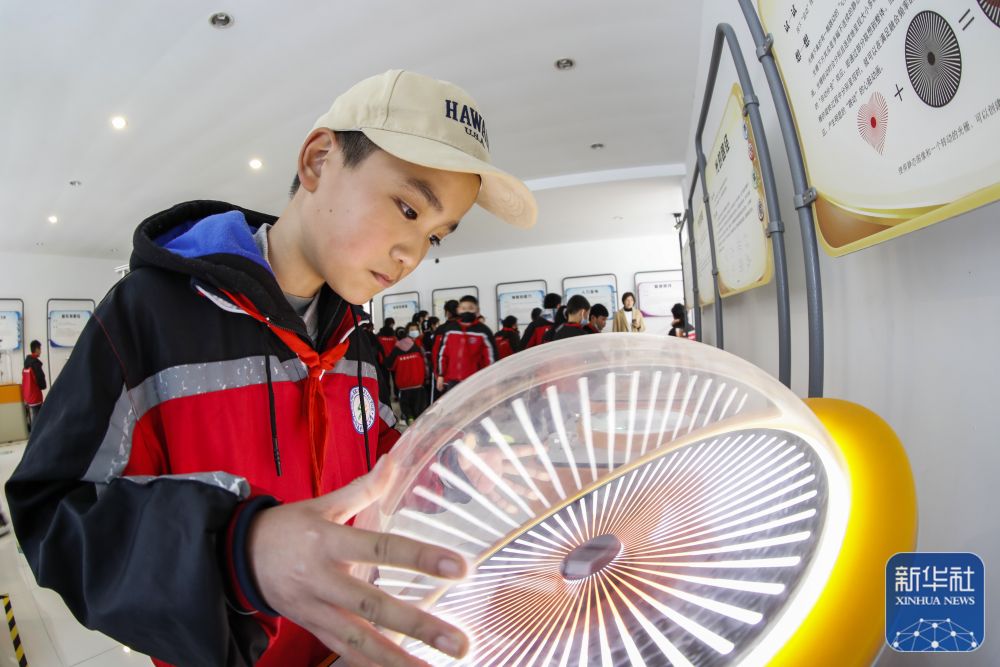 4月6日,江苏省宿迁市泗阳县黄河路小学学生在科技馆内体验科普项目,近距离感受科技魅力。新华社发(裴成摄)