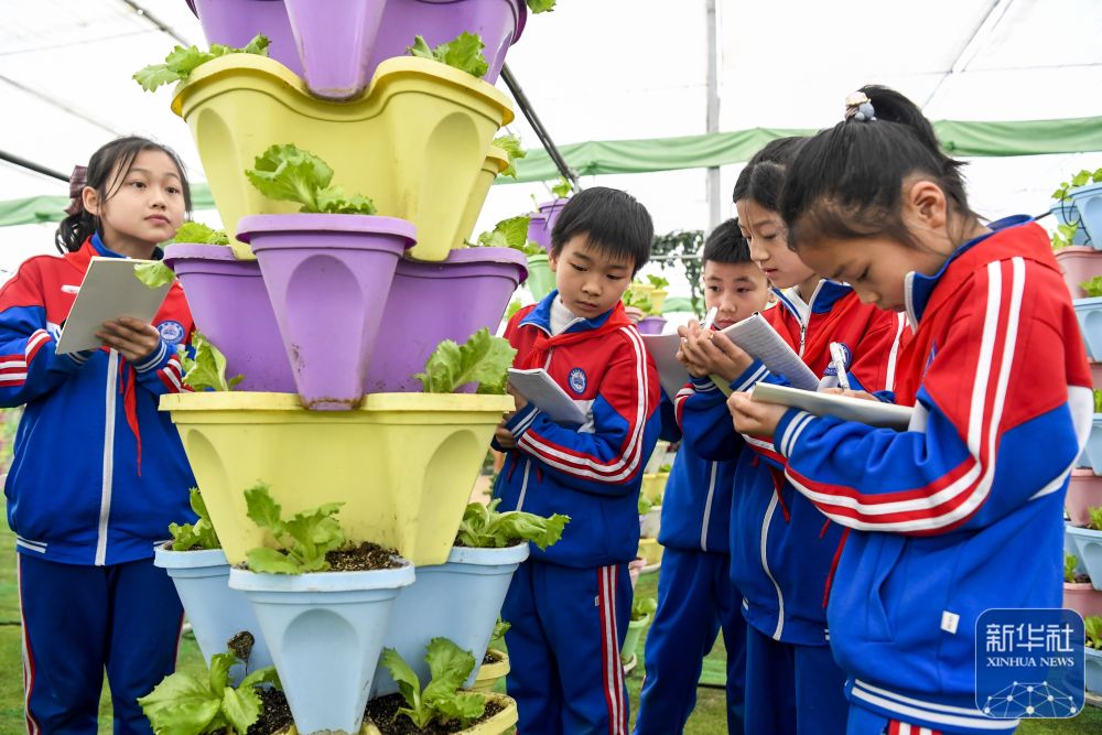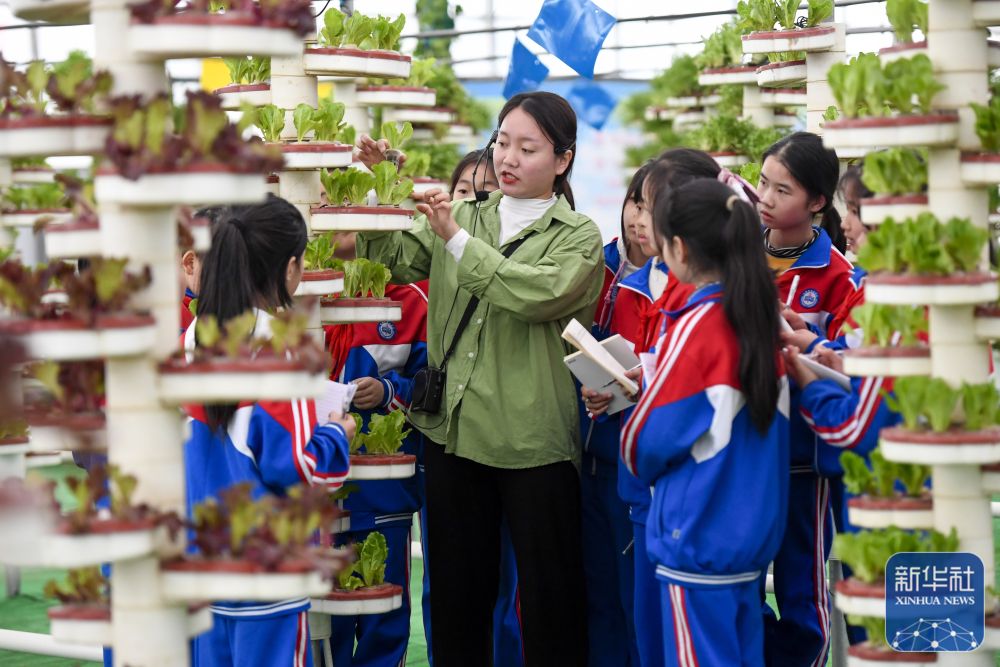4月6日,江西省宜春市袁州区袁山学校的学生在西村镇现代农业示范园区富硒农业科普馆参观了解无土栽培、螺旋仿生栽培等现代农业技术知识。