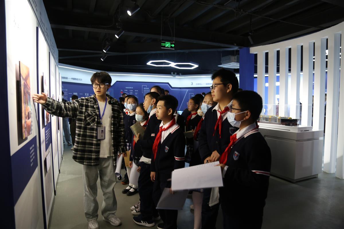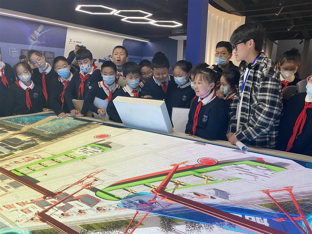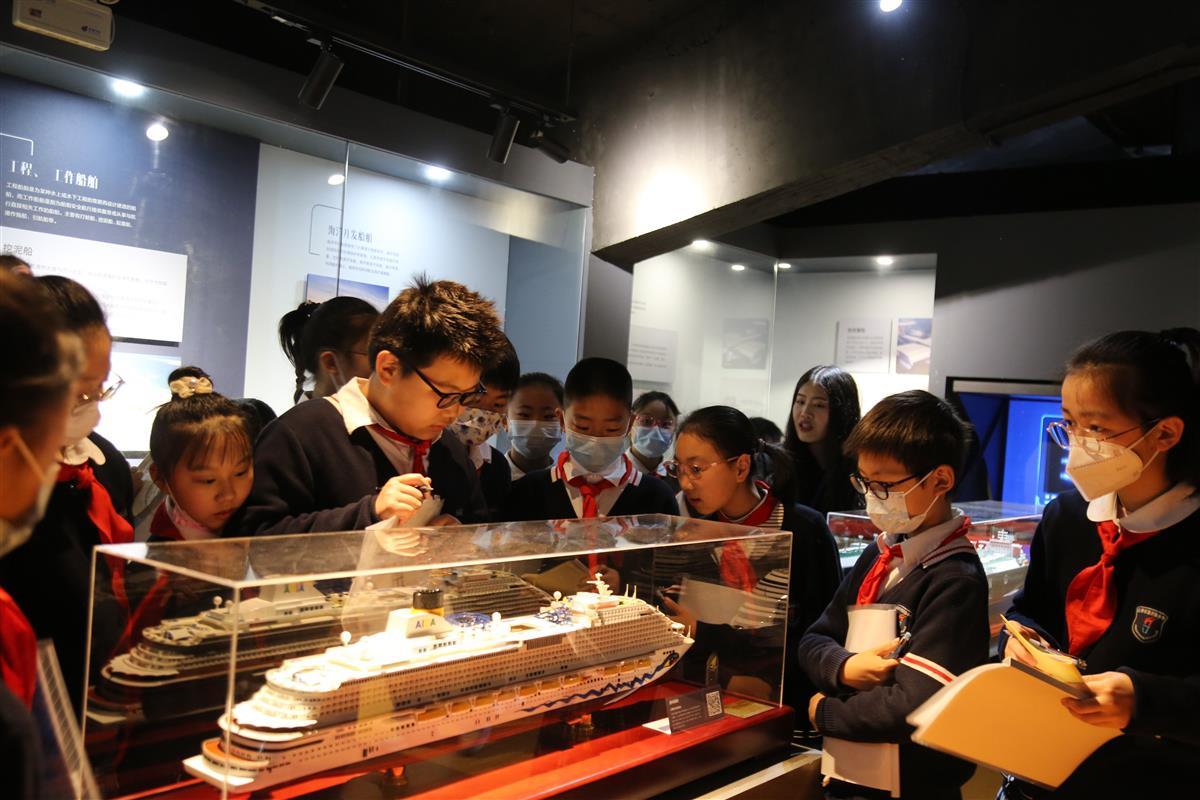 在武汉船舶职业技术学院大学生志愿者的讲解和带领下,惠济路小学同学们依序参观了舰船与航海博物馆“船·育”(船院校史)、“船·忆”(驭海史话)、“船·梦”(当代舰船)、“船·造”(船舶先进建造工艺)、及“船·行”(船舶航行技术)五大主题展区。