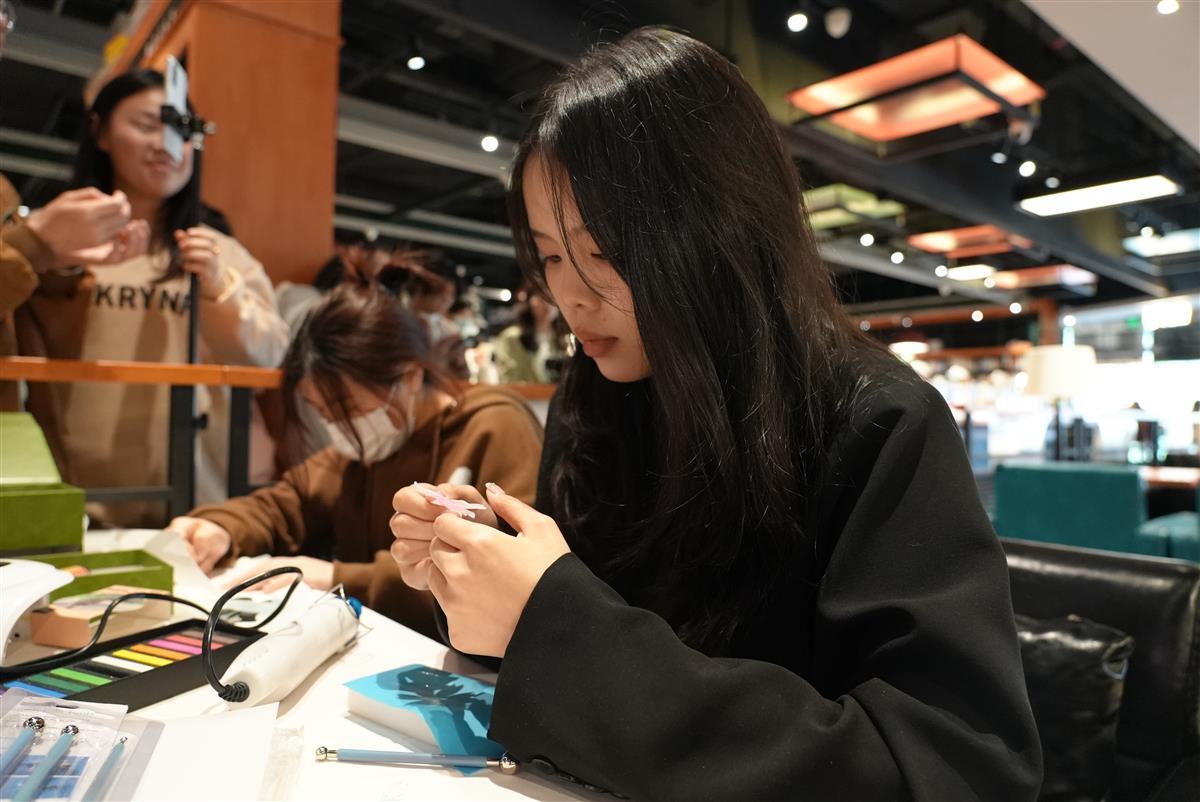 与平时的课堂不同,在开放式的书店,师生完成热缩片首饰陈列及花卉团扇成品,热缩片现场制作,现场国风牛皮纸袋填色(纸宠和花卉)等内容,不单单是教学内容,也是一种教学展示。