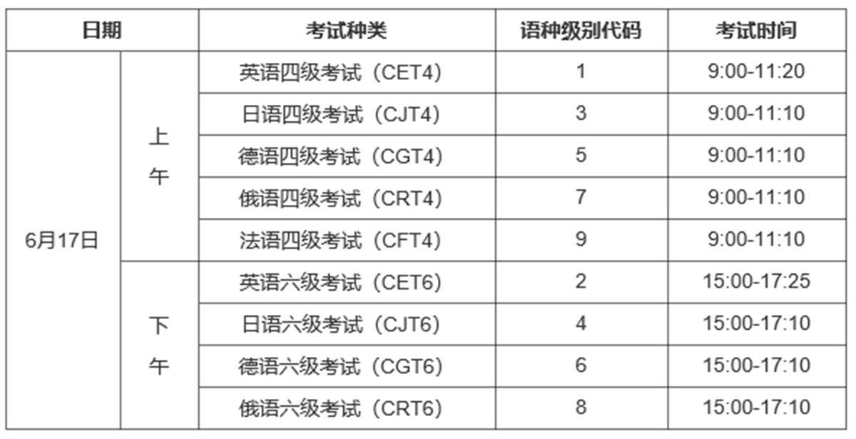 CET考试时间为6月17日,上午开考四级(英语、日语、德语、俄语和法语),下午开考六级(英语、日语、德语和俄语)。具体场次安排如下: