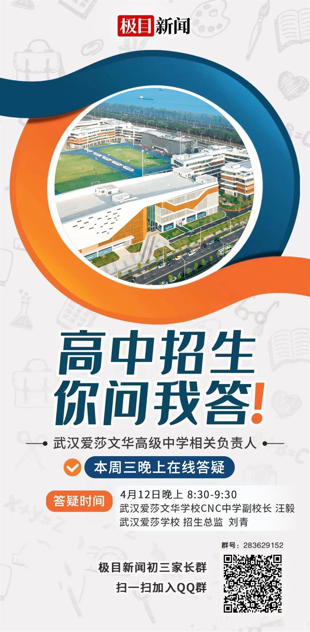 4月12日(本周四)晚8:30-9:30,极目新闻的三个家长群里,将同步举行武汉爱莎文华高级中学专场答疑活动。届时,武汉爱莎文华学校CNC课程中心中学副校长汪毅、武汉爱莎学校招生总监刘青,将解答各位家长的疑问。