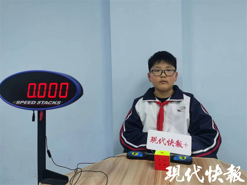 在一张桌子前,钱梓豪正翻转观察着手中的三阶魔方,几秒钟后,他将魔方置于桌上,双手平放在触碰式魔方计时器上,随后抓起魔方开始还原,抬手的瞬间,计时器开始走动。电光火石之间,魔方已经还原,计时器显示用时7.905秒。记者肉眼难以看清其还原的过程。