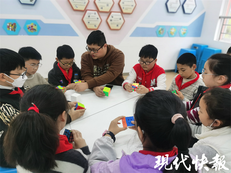 近日,在望亭中心小学魔方馆,现代快报记者见到了这对师徒。省智运会将近,钱梓豪正在吴闻俊的指导下进行赛前特训。