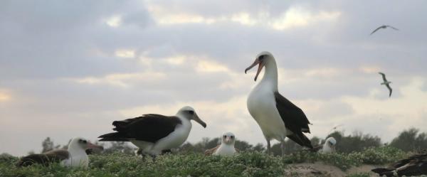 信天翁成鸟翼展可达三米多,主要借海上空气对流飞行,通俗地说就是滑翔,只要展开翅膀——甚至不需要拍一下,就可以在空中遨游。这种飞行方式决定了它们每年都会有很长时间呆在海洋上空,甚至几个月都不落地。这样当然很难寻找配偶,所以它们一旦组建家庭,就不再分开,以此节省寻找配偶的时间,同时带给后代最好的照顾。所有的雄性信天翁都奉行好好先生策略,雌性也十分配合地对其他异性的勾引视而不见。信天翁的父权高度明确,可以说,这是它们采用晚成鸟策略的底气。