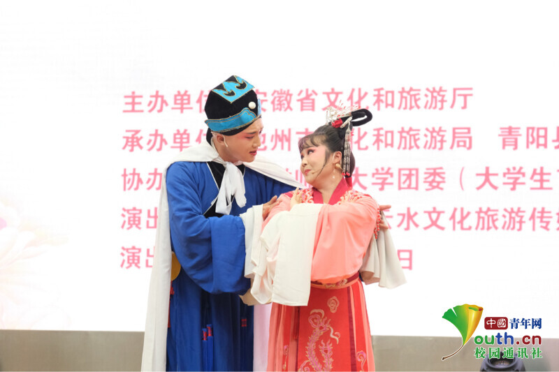 演出现场,青阳腔《圆月桥》首先亮相,唱腔变化灵活多样,戏曲语言通俗易懂,带领观众逐渐感受青阳腔的艺术魅力。“我觉得青阳腔剧种和其他戏曲还是有很大不同的!”该校文学院的储紫婧同学是第一次现场欣赏青阳腔艺术,她认为,青阳腔的唱腔更接近口语的韵文和朗诵歌腔,一唱众和,演奏方式及剧目选集也都极具特色。
