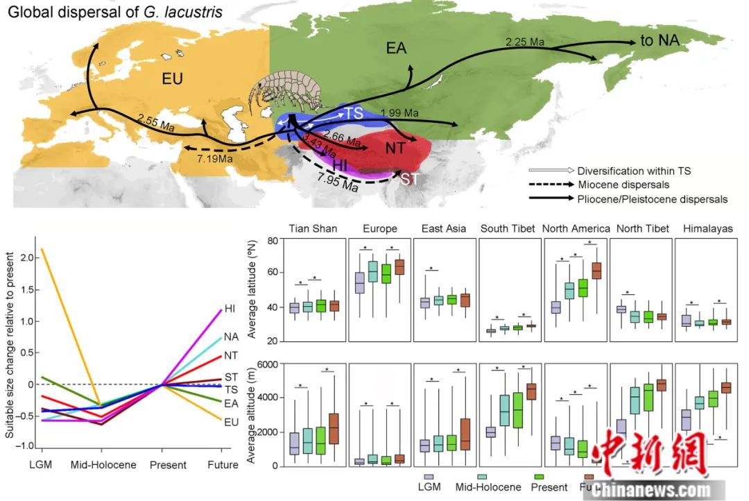 此次野外调查研究发现,高山湖泊是冷水性钩虾全球迁移扩展的通道,更新世气候变冷形成大量高山湖泊或冰川湖,驱动钩虾多次从天山拓殖到全球高山湖泊以及环北寒带冰川湖泊中,该研究定义这种新的分化方式为“出芽式分化”。研究还发现,未来气候变暖将导致钩虾局限在更高海拔更高纬度,造成遗传多样性降低。