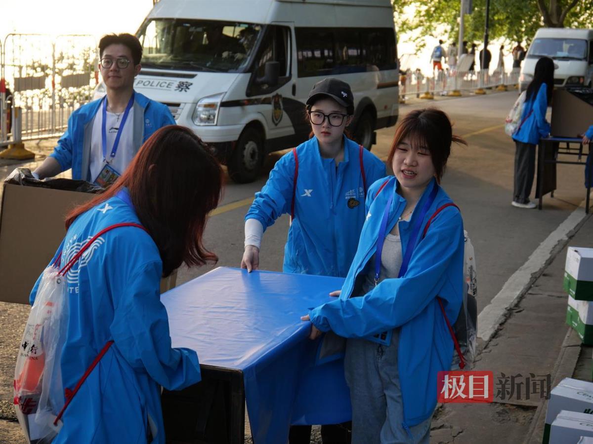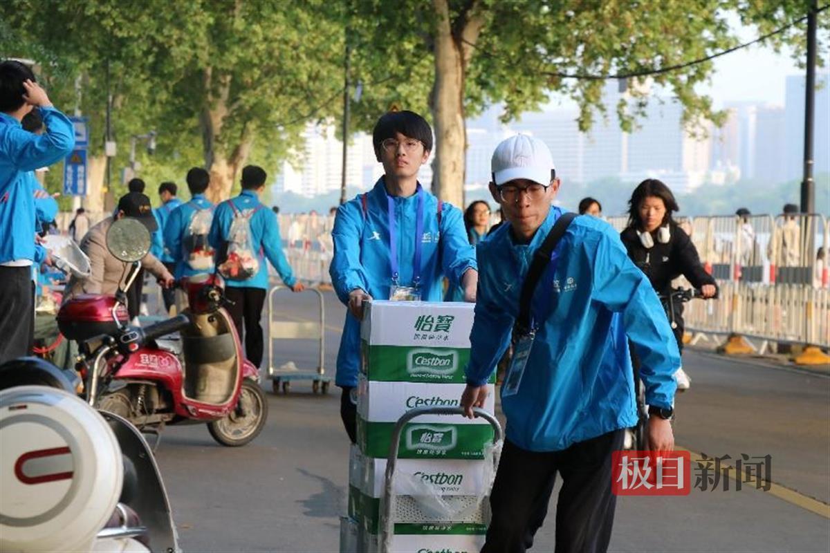 凌晨5时许,在晨光熹微时,大巴车到达服务点位。一下车,志愿者们便开始忙碌起来,“男生搬运物资,女生摆放补给物资”,学院党建会志愿服务部部长、汉马志愿者校内组织负责人佟侗有条不紊地安排工作。7时30分,两个服务站点所有准备工作全部完成,26张桌子依次排开,按照汉马组委会要求铺上红、蓝、白不同颜色的桌布,将纸杯摆放在桌面上,倒上水或饮料。