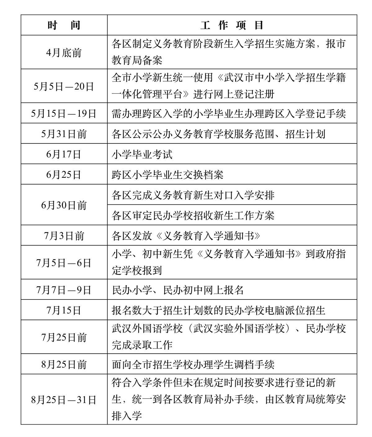 (一)凡因搬迁或者其他特殊原因,需跨区入学的小学毕业生,应由其父母或其他法定监护人向学生所在学校提出申请,填写登记表,学校审查同意后,分别到所在区教育局和跨入区教育局办理跨区入学手续,探索使用《武汉市中小学入学招生学籍一体化管理平台》实行网上办理。办理跨区入学手续时间,全市统一为5月15日—19日。各区教育局应将跨区学生有关档案集中,于6月25日办理交换手续(地点另行通知)。