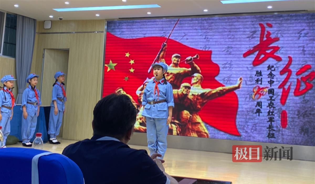 分享会现场,三年级(1)班的五名同学表演了长征中《半条棉被》的故事,以讲述和演绎的形式再现书中的内容。作为情景表演中讲解员的饰演者,三年级(1)班的学生王夕瑶为观众讲述了3名女红军借宿徐解秀老人家中,临走时,把自己仅有的一床被子剪下一半给老人留下的故事。