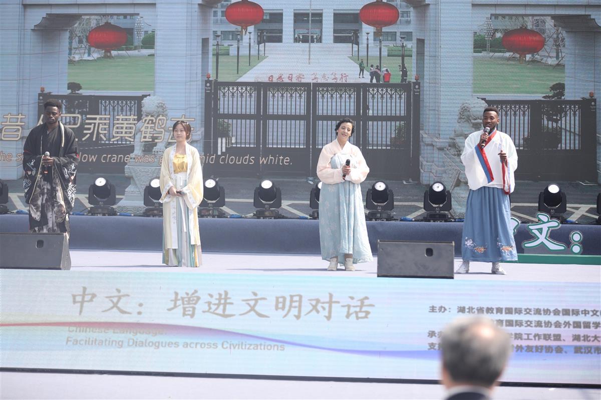 开幕式上,湖北大学国际学生卫拉和艾德华带来朗诵作品《致橡树》,该作品作为湖北省高校国际中文教育优秀成果,2022年底获得第四届“诵读中国”经典诵读大赛留学生组全国一等奖。湖大海悦、李国强、李国庆、赵书仪等国际学生历经3个月筹备,为观众送上《黄鹤楼》现场演唱。