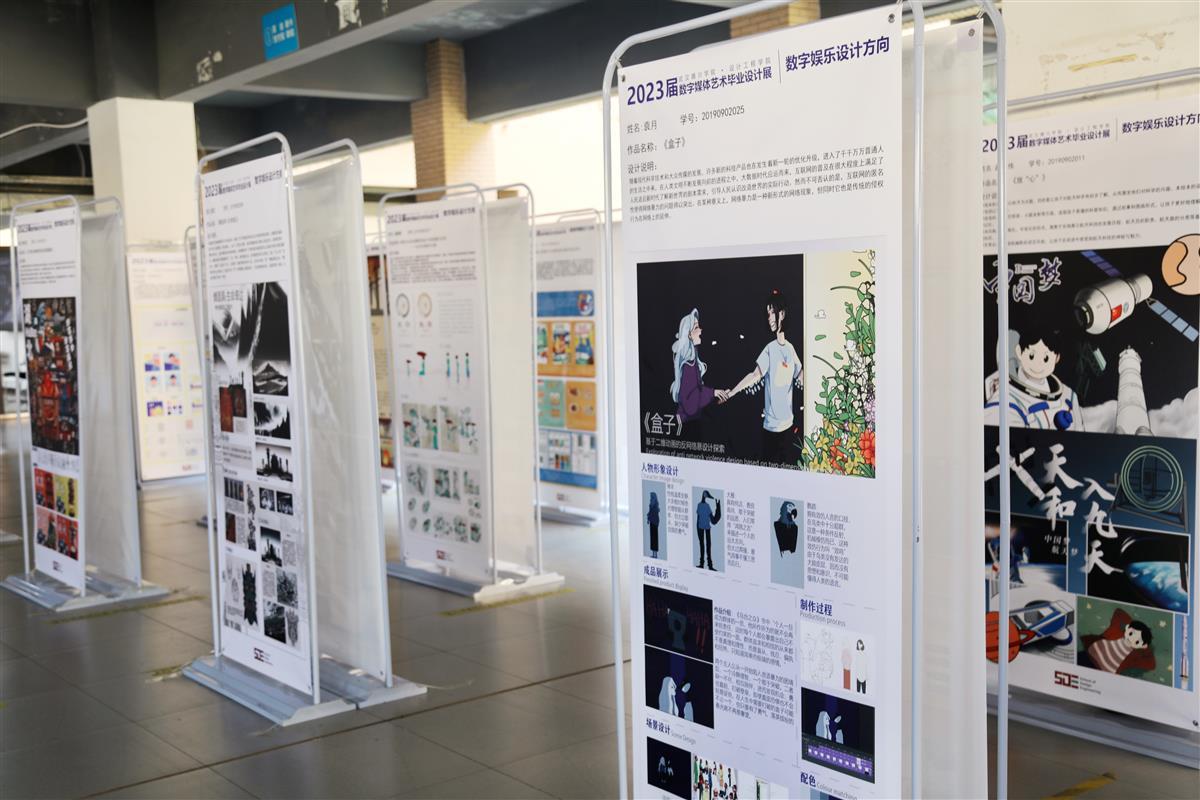 在展览现场,设计工程学院院长楚东晓介绍,此次毕业设计展以“新时代·新思路·新影像”为主题,来自产品设计专业和数字媒体艺术专业的毕业生们,在以“传统文化资源与新兴数字科技的结合”为背景的基础上,发挥各自专业优势,通过海报设计、数字动画、装置、文创、交互设计视频、VR游戏、3D打印模型等多种艺术类型,展示自己对流行文化、传统文化、未来科技、社会现象等的关注和思考。