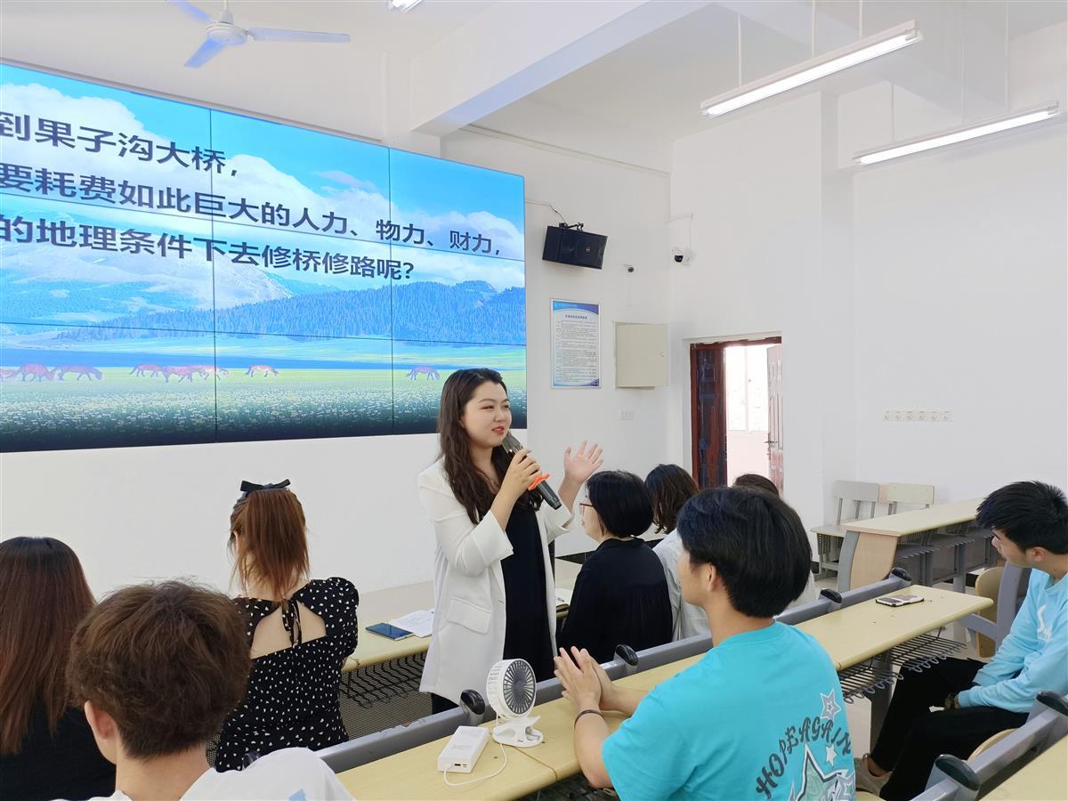 其中,申老师重点讲述了果子沟大桥,“修这座桥,到底有多难?”她从被称为“铁关”的果子沟历史讲起,构建起同学们对建设果子沟大桥既迫切需要又困难重重的矛盾认同;接着从“新技术、新工艺、新结构、新设备”四个方面进行讲述,展现中国建桥人在极端环境下进行技术创新和施工的建桥精神。