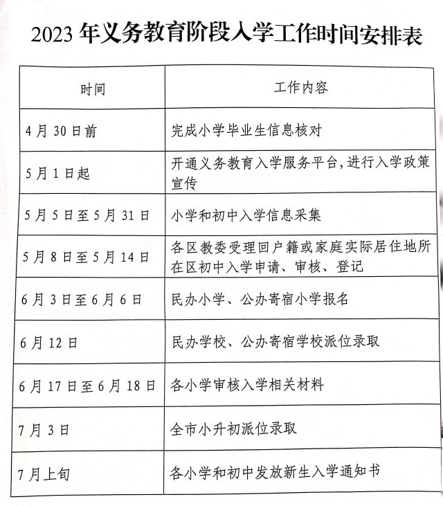 5月8日至5月14日,各区教委受理回户籍或家庭实际居住地所在区初中入学申请、审核、登记。6月3日至6月6日进行民办小学、公办寄宿小学报名。6月12日进行民办学校、公办寄宿学校派位录取。6月17日至6月18日各小学审核入学相关材料。7月3日启动全市小升初派位录取。7月上旬进行各中小学和初中发放新生入学通知书。