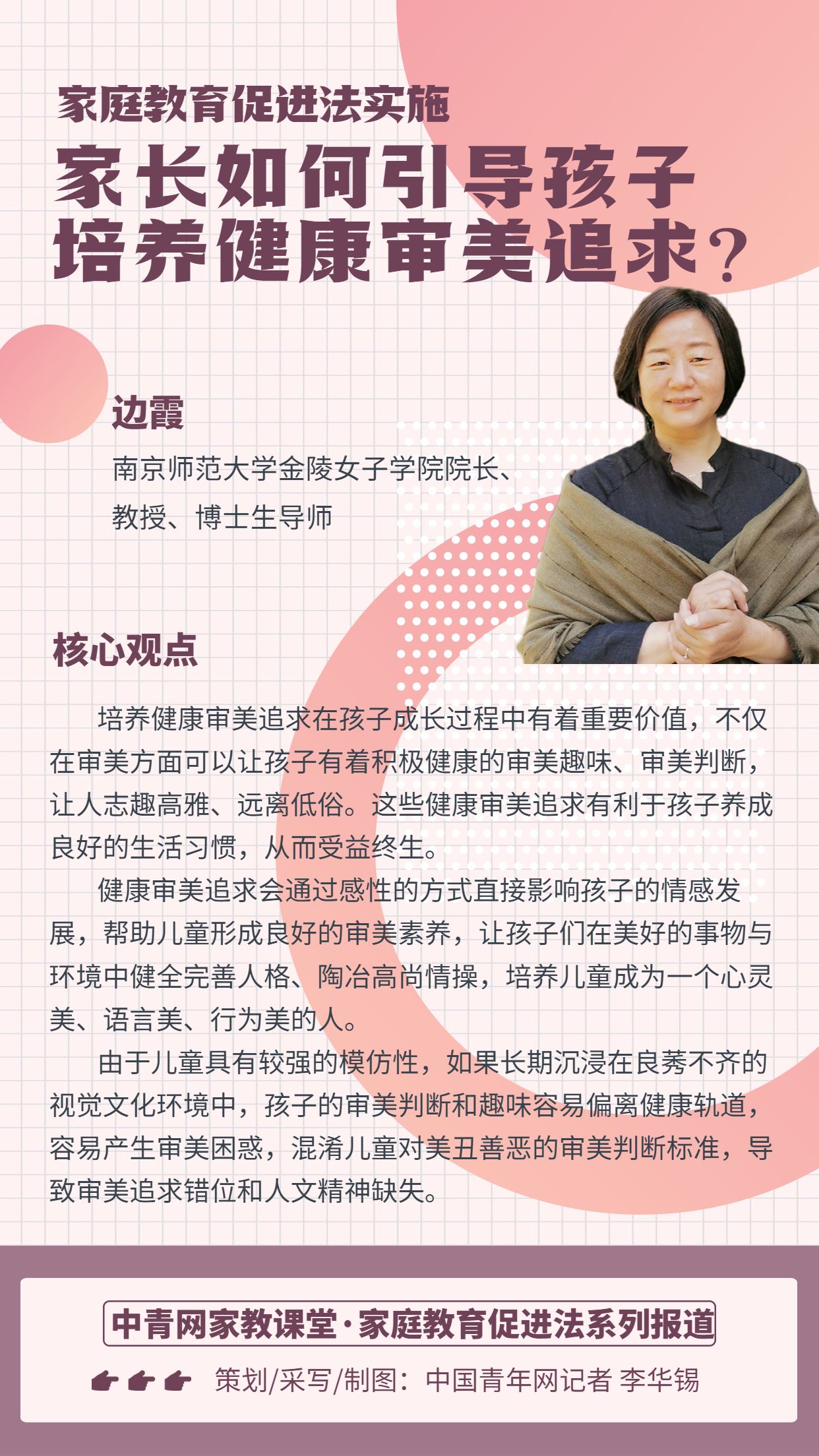 《家庭教育促进法》提到家长要引导未成年人培养健康审美追求。健康的审美追求包括哪些?边霞认为,审美追求包含着人在进行审美活动时所反映出来的审美判断和审美趣味。健康审美追求不仅要满足人们当下普遍的审美需求,也要在此基础上超越当下的审美需求走向更高层次。