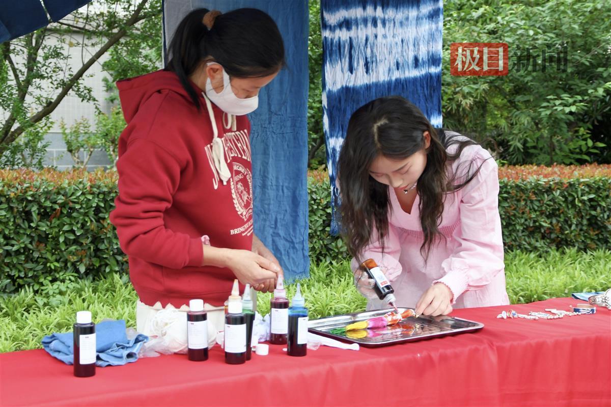 活动现场,一位同学将自己一件掉色的衣服带到现场请李丹丹老师“救急”,并在老师的指导下,动手尝试捆扎、簇扎、板夹等扎染方法。李丹丹老师一边演示扎染的工艺流程,一边介绍扎染的制作原理及操作方法。她介绍说,“扎染是我国古老而独特的一种织物染色技艺,被列入国家级非物质文化遗产。‘非遗’传承和推广需要青年一代的支持和参与,希望你们能够爱上植物扎染,将植物扎染这项传统技艺传承下去。”