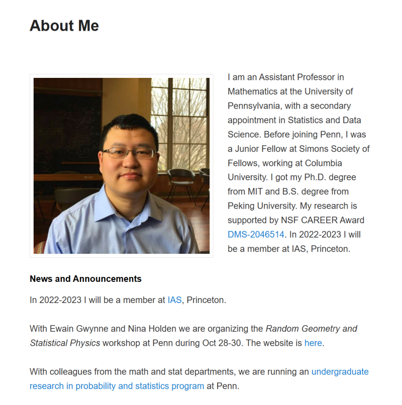 目前,孙鑫为宾夕法尼亚大学数学系助理教授,兼任统计与数据科学助理教授,并为普林斯顿高等研究院访问学者。孙鑫主要从事概率论和数学物理等方面的研究,曾获得美国国家科学基金会早期事业奖(NSFEarlyCareerAward)、2020年度伯努利学会新研究员奖。