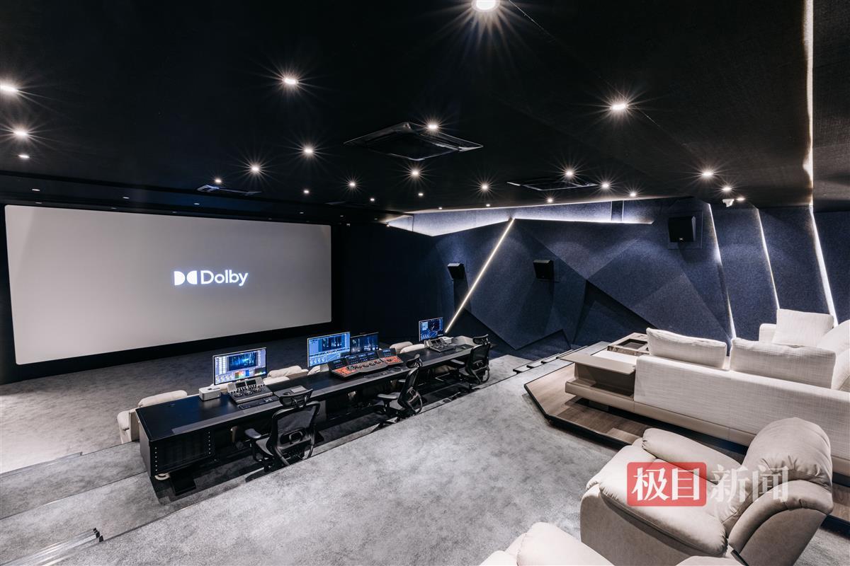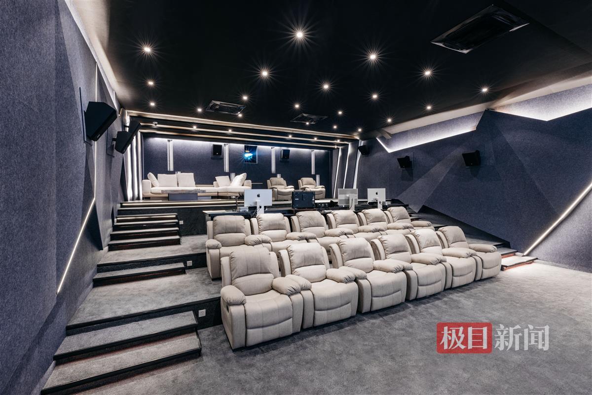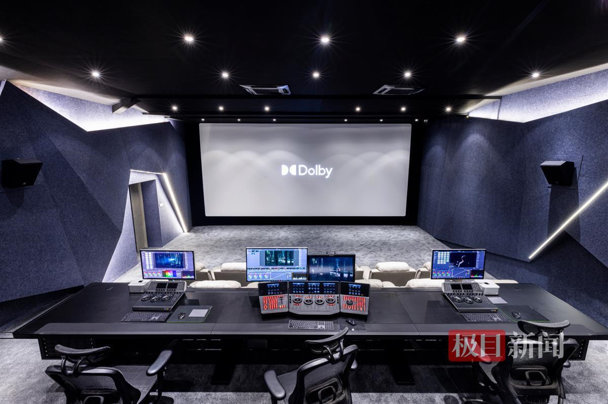此外,实验室内部还设计成可播放杜比(Dolby)影片的导演厅样式。厅内配备美国科视(Christie)超高清数字放映机、英国哈克尼斯(Harkness)数字透声穿孔银幕,最大程度还原成片的声音与画质,14座观影席位模拟影院布局,方便师生在完成影片制作实战课程后一同审阅成品。