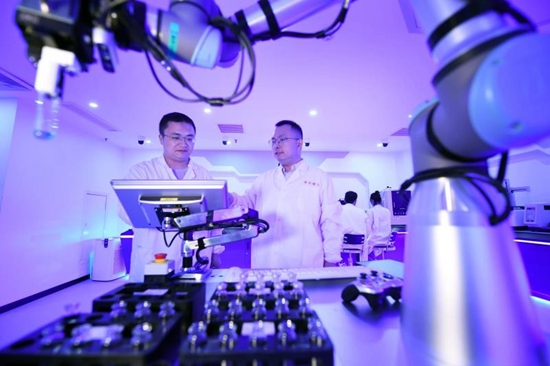 在精准智能化学重点实验室中的机器化学家实验室,青年科研人员只需在控制大屏输入指令,两个动作灵活的机器人“小来”和“小福”就可以在几个操作台间穿梭,伸出机械手臂进行试剂配制。