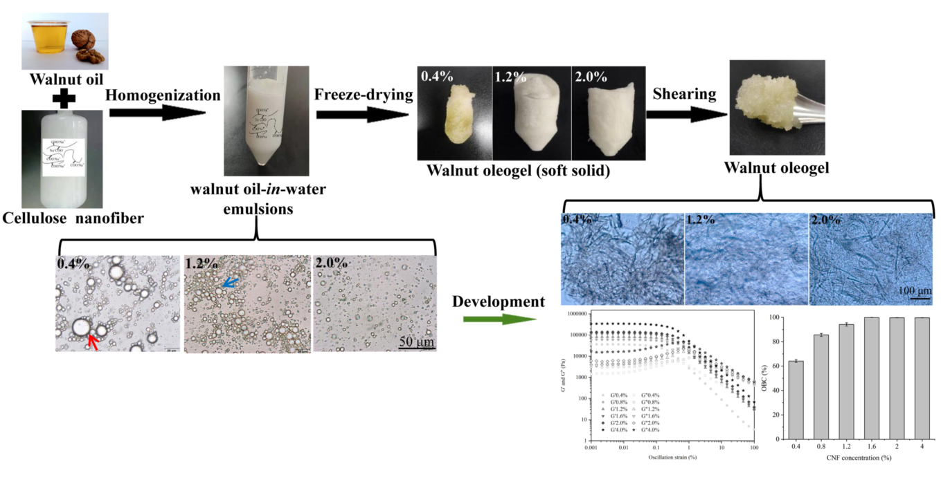 研究团队以具有特殊结构和生物降解性、机械性能优越、表面活性强的食用纳米纤维素作为唯一凝胶因子,以核桃油为载体,通过乳液模板法,成功构造出性能良好的核桃油凝胶,使核桃油变身“植物黄油”。