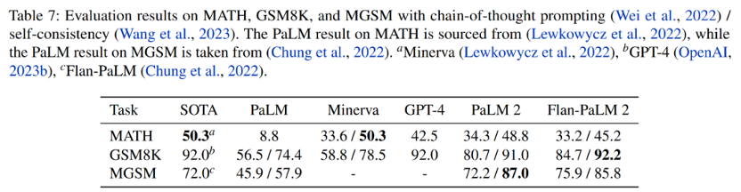 根据基准测试,对于具有思维链prompt(提示)或自洽性的MATH、GSM8K和MGSM基准评估,PaLM2的部分结果超越了GPT-4。