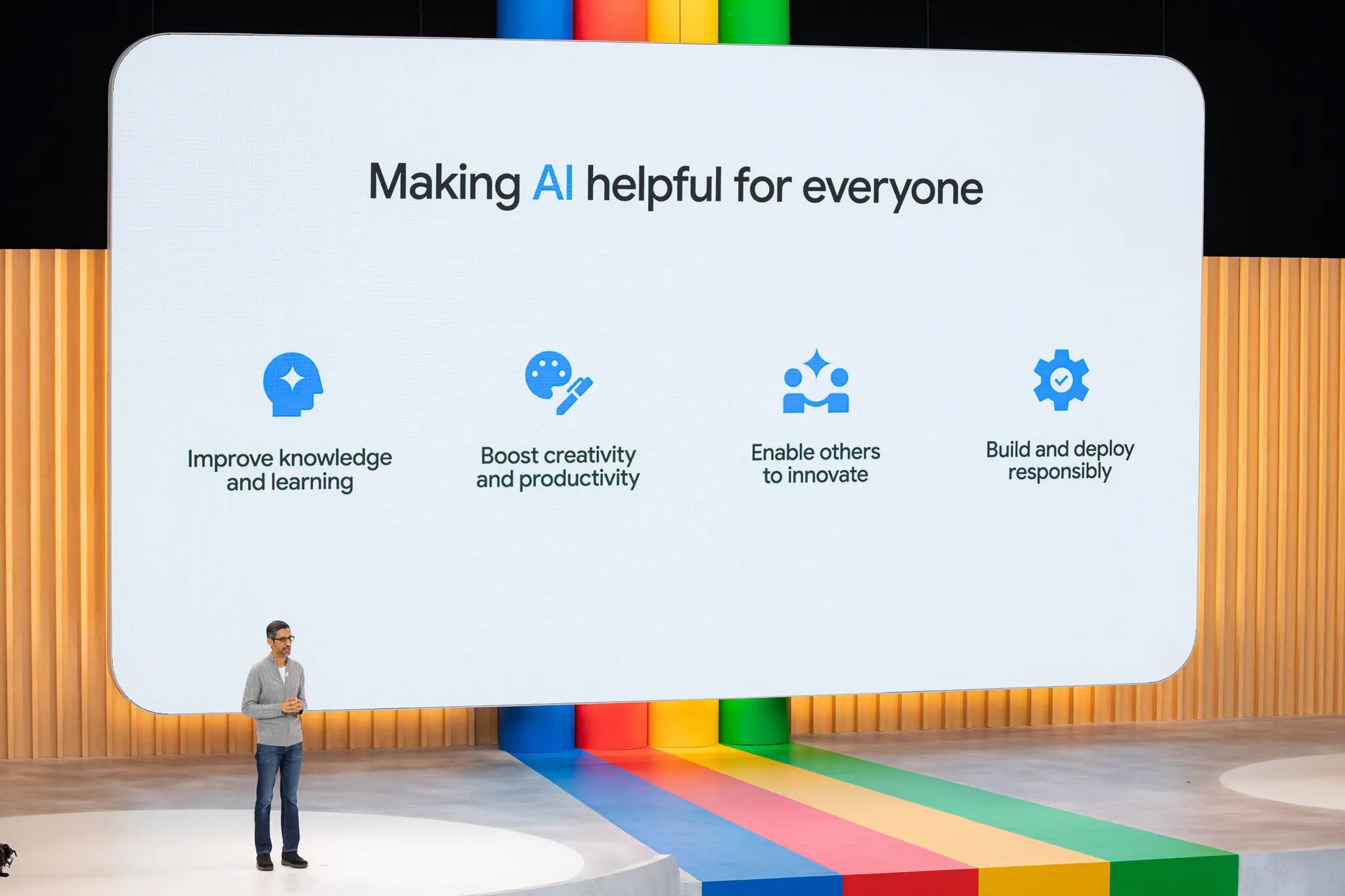 谷歌首席执行官桑达尔·皮查伊(SundarPichai)在2023年I/O开发者大会上。