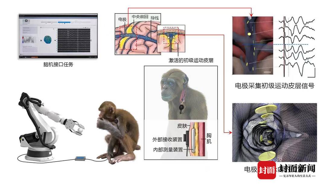 近期,全球首例非人灵长类动物介入式脑机接口试验在北京获得成功,实验人员在猴脑内实现了介入式脑机接口脑控机械臂的技术飞跃。